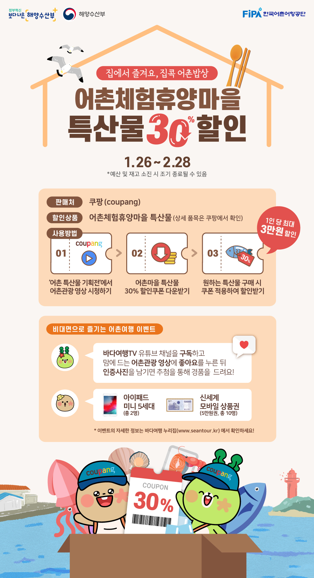 | [한국어촌어항공단] 어촌체험휴양마을 특산물 30% 할인 안내 |