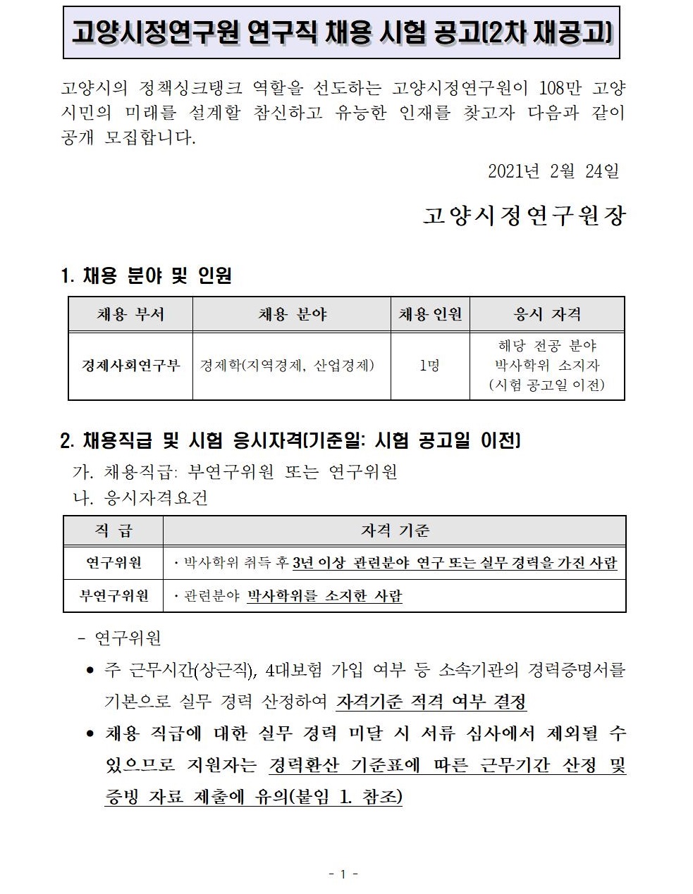 고양시정연구원 연구직 채용 시험 공고(2차 재공고).hwp