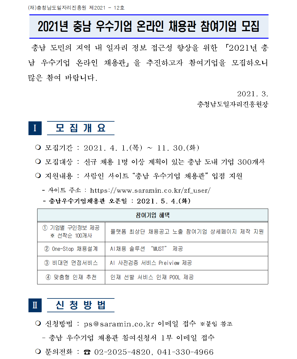 | [충청남도일자리진흥원] 20201년 충남 우수기업 온라인 채용관 참여기업 모집 |