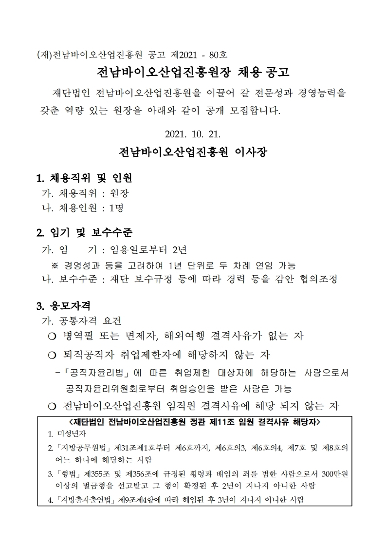| [(재)전남바이오산업진흥원] 재단법인 전남바이오산업진흥원장 채용(재공모) 공고 |