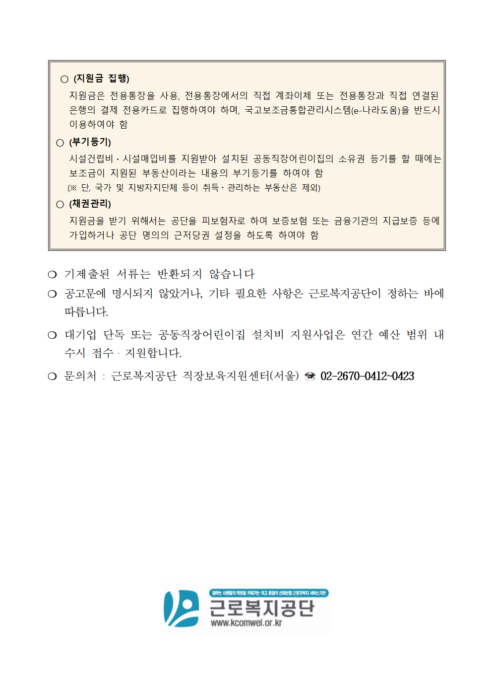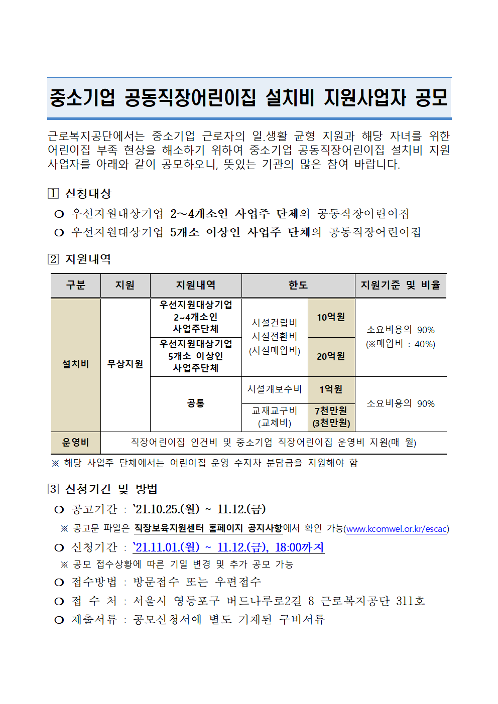 | [근로복지공단] 2021년 중소기업 공동직장어린이집 설치지 지원대상자 공모 |