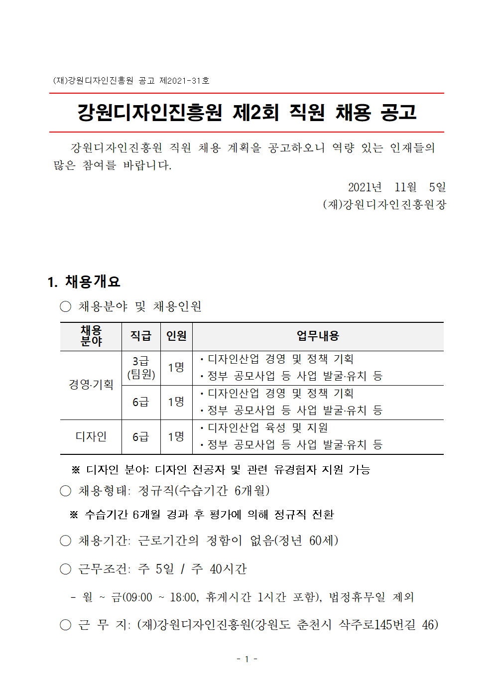 | [(재)강원디자인진흥원] 강원디자인진흥원 2021년 제2회 직원 채용 공고 알림 |