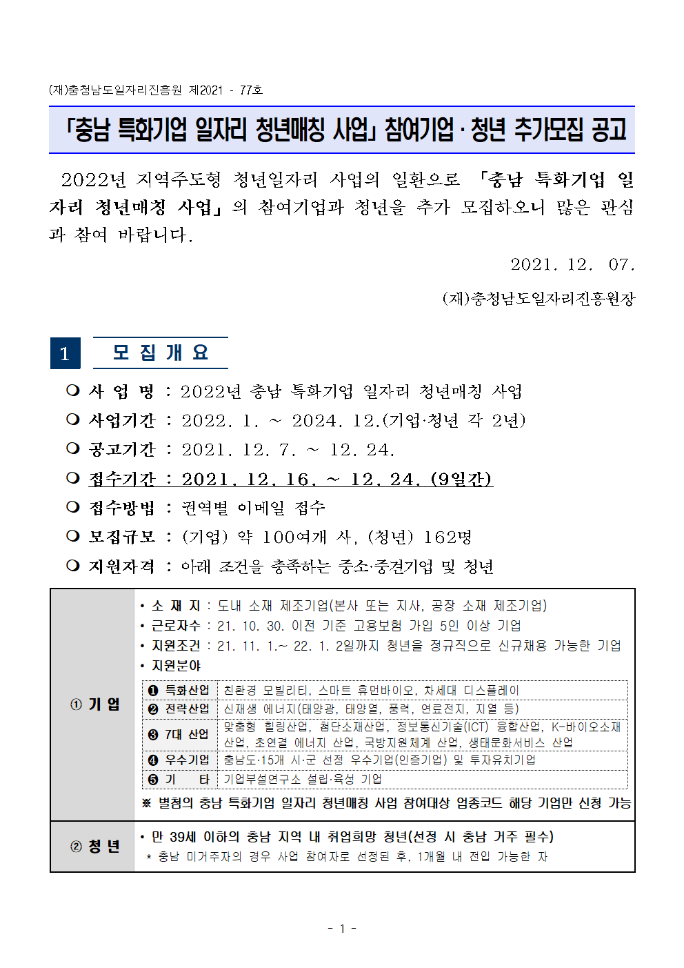 | [(재)충청남도일자리진흥원] 충남 특화기업 일자리 청년매칭 참여기업 및 청년 추가모집 공고 |