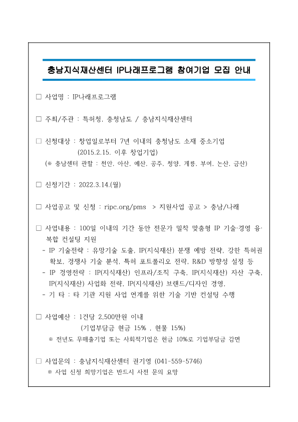 | [충남지식재산센터] 충남지식재산센터 IP나래프로그램 참여기업 모집 안내 |