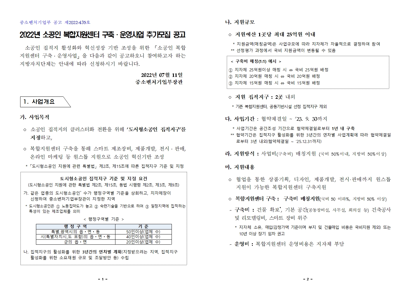| [중소벤처기업부] 2022년 소공인 복합지원센터 구축·운영사업 추가 모집 공고 |