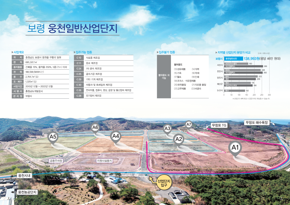 웅천일반산업단지 현황 ◈ (사업위치) 웅천읍 구룡리 일원(무창포 IC 입구) ◈ (단지규모) 685,322.1㎡(208천평) / 산업용지 482,620㎡(146천평) ◈ (유치업종) 금속, 기계 및 운송, 식료품, 정밀(전자부품, 통신장비 등) ◈ (용지활용) 건폐율 70%, 용적율 250%, 높이 5층(25m) 이하 ◈ (분 양 가) ㎡당 138,993원(평당 46만 원) ◈ (사업기간) 2010년∼2022년