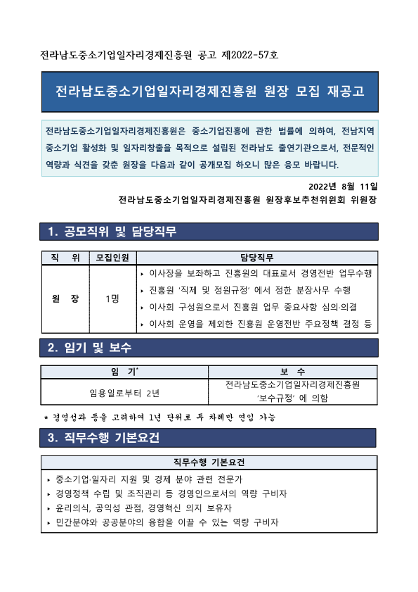 | [전라남도중소기업일자리경제진흥원] 전라남도중소기업일자리경제진흥원장 모집 재공고 |