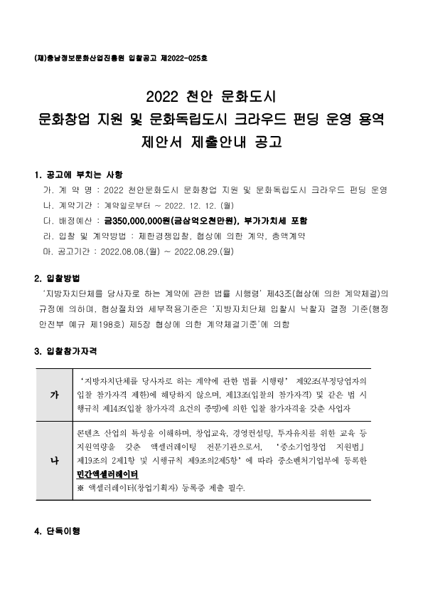 | [천안문화도시센터] 2022 천안문화도시 문화창업지원 및 크라우드펀딩 입찰 용역공고 |