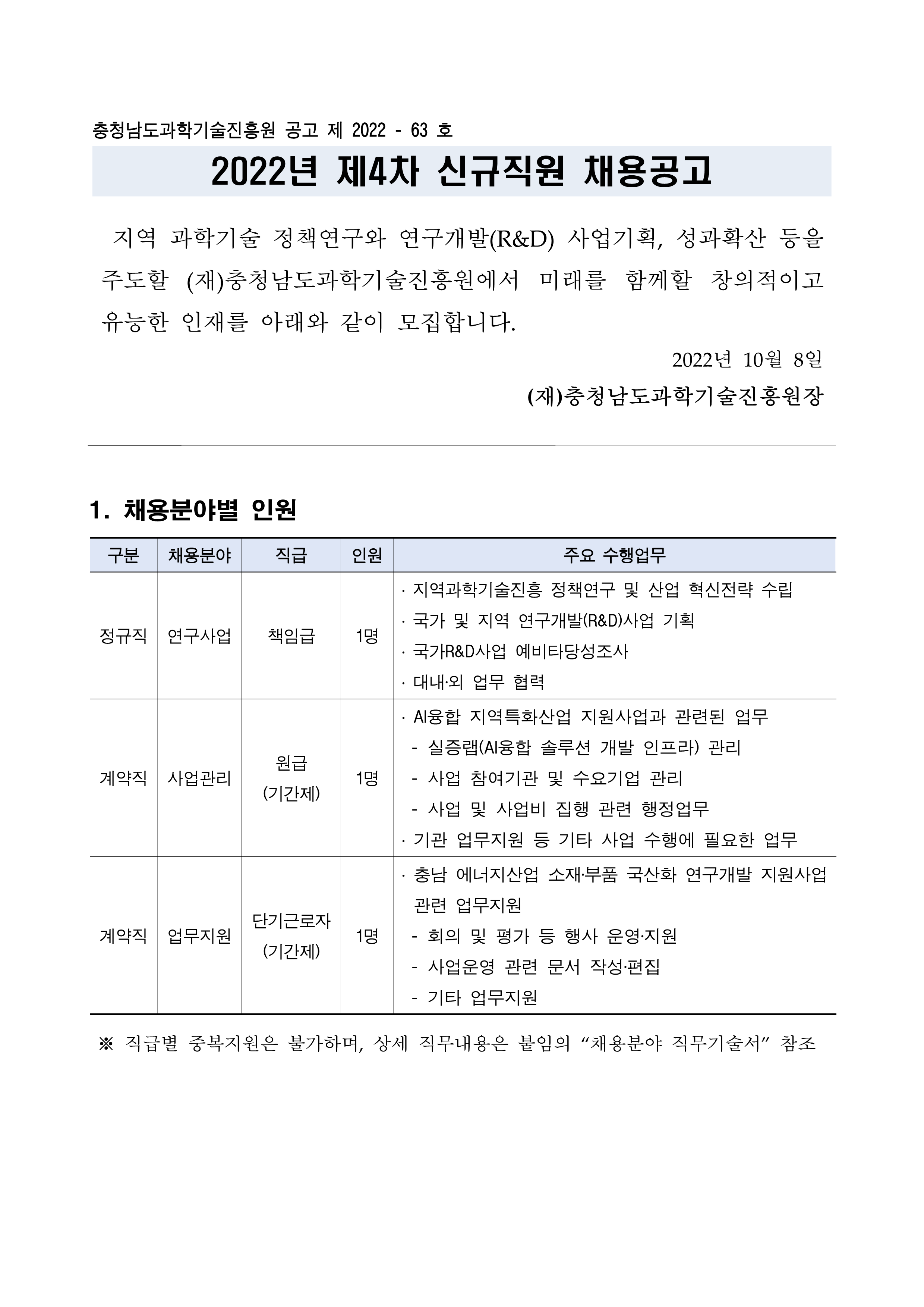 | [충청남도과학기술진흥원] 2022년 제4차 충청남도과학기술진흥원 신규직원 채용 공고 |