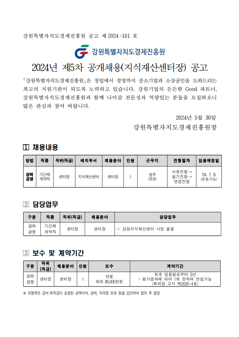 | [강원특별자치도경제진흥원] 2024년 제5차 공개채용(지식재산센터장) 공고 |