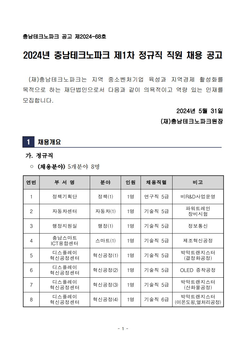 | [충남테크노파크] 2024년 제1차 정규직 채용 공고 |