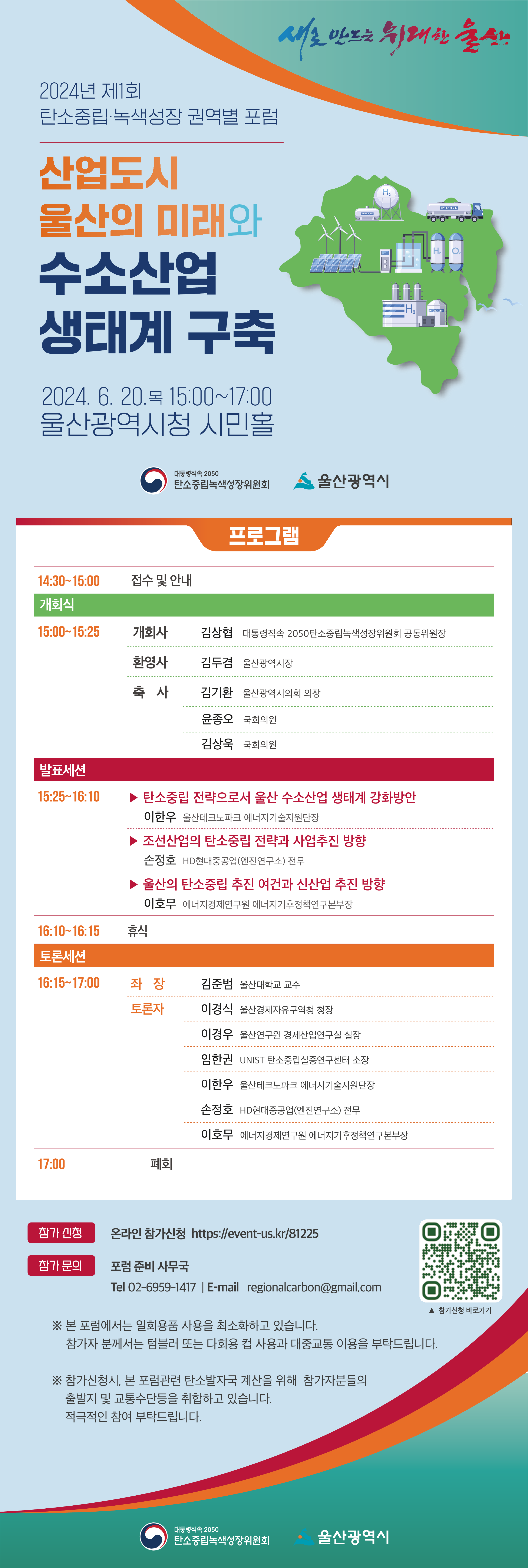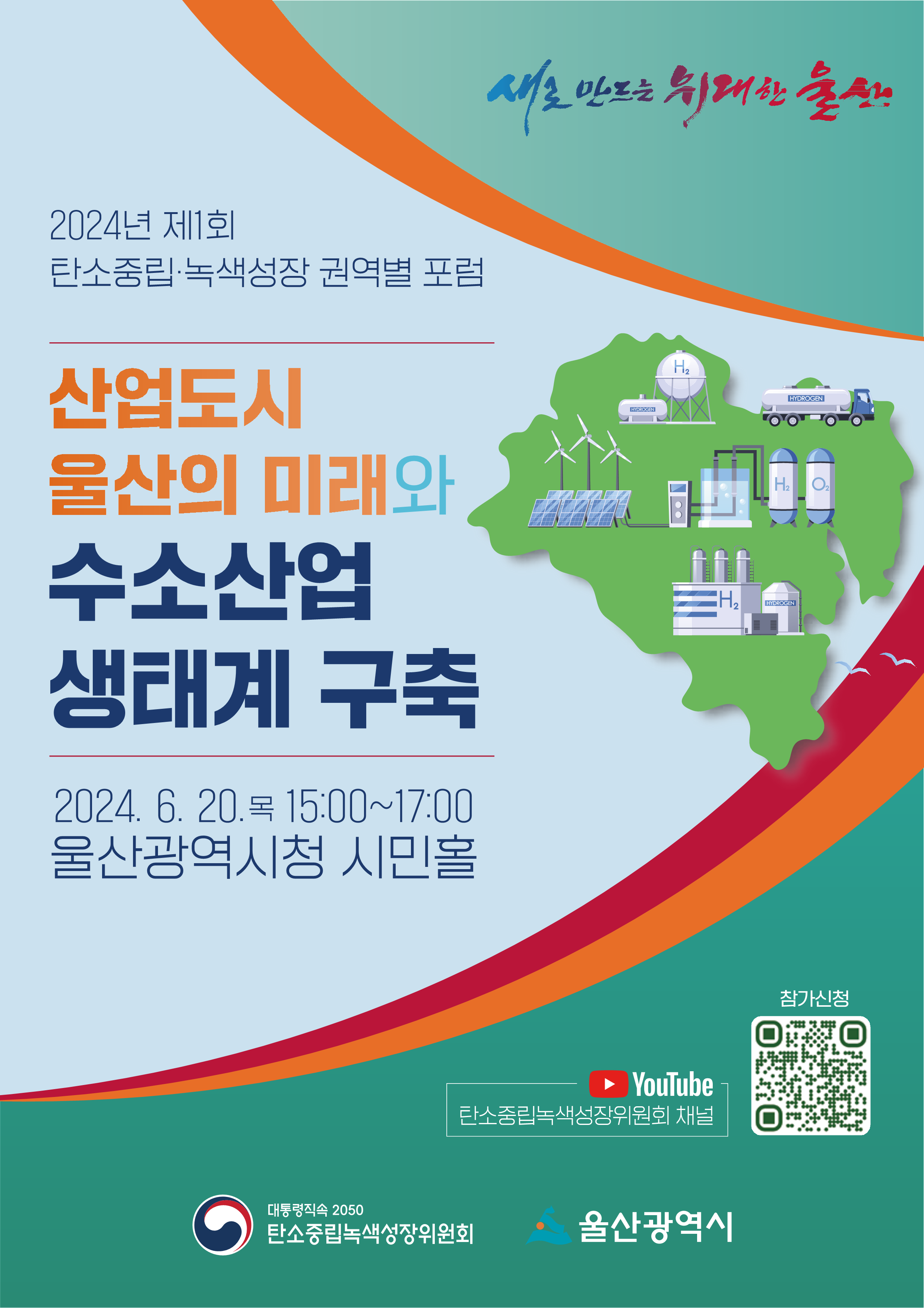(일 시) : 2024. 06. 20.(목) 15:00 ~ 17:00 (장 소) : 울산광역시청 시민홀 (주 제) : 산업도시 울산의 미래와 수소산업 생태계 조성 (주요내용) : 개회식, 주제발표, 패널토론 등 ※ 유튜브 채널 : https://www.youtube.com/@2050cnc (탄소중립녹색성장위원회) |
