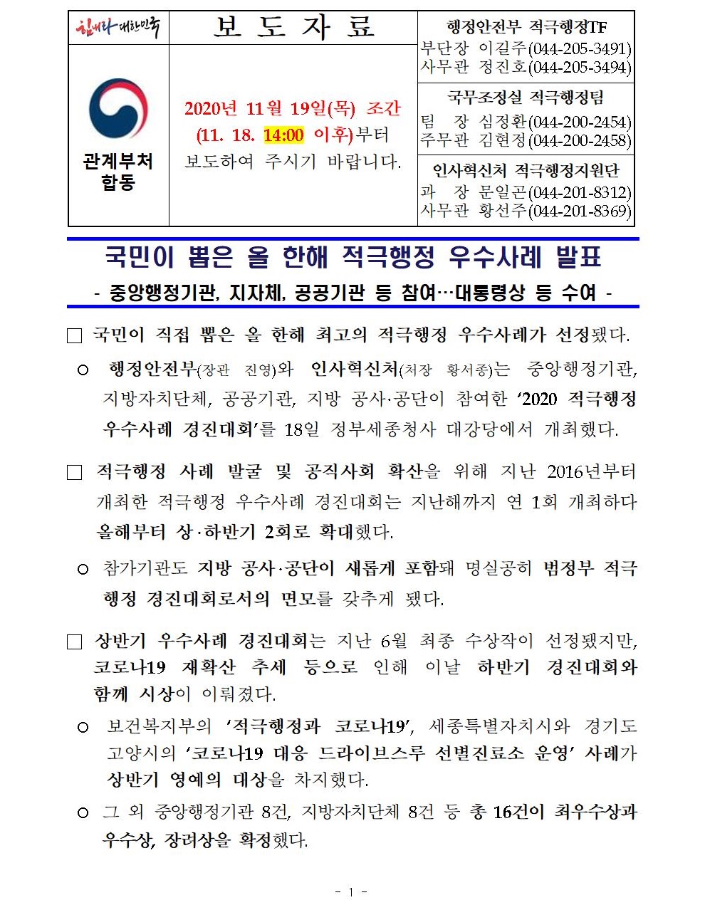 201119 (조간) 국민이 뽑은 올 한해 적극행정 우수사례 발표(적극행정TF).hwp
