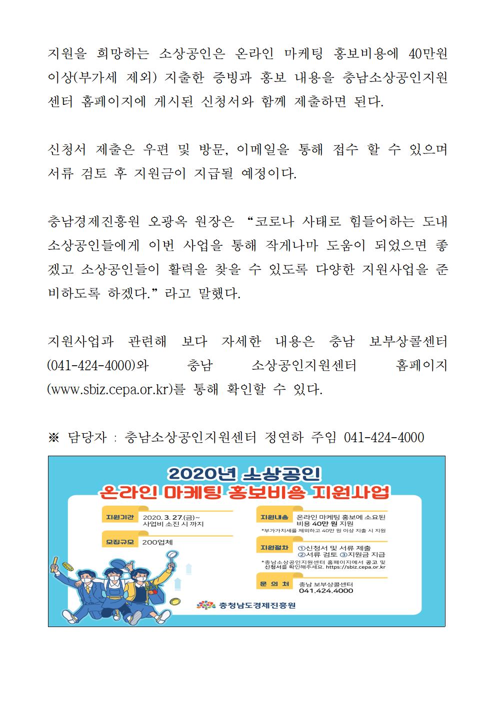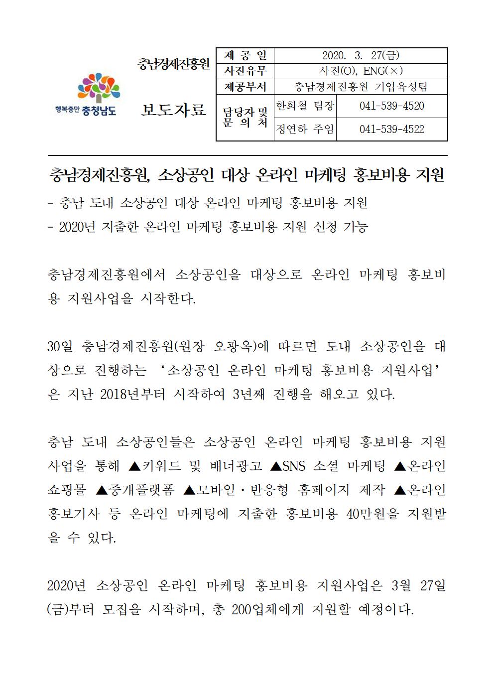 | 충남경제진흥원, 소상공인 대상 온라인 마케팅 홍보비용 지원 사업 진행 [2020.03.27] | |||