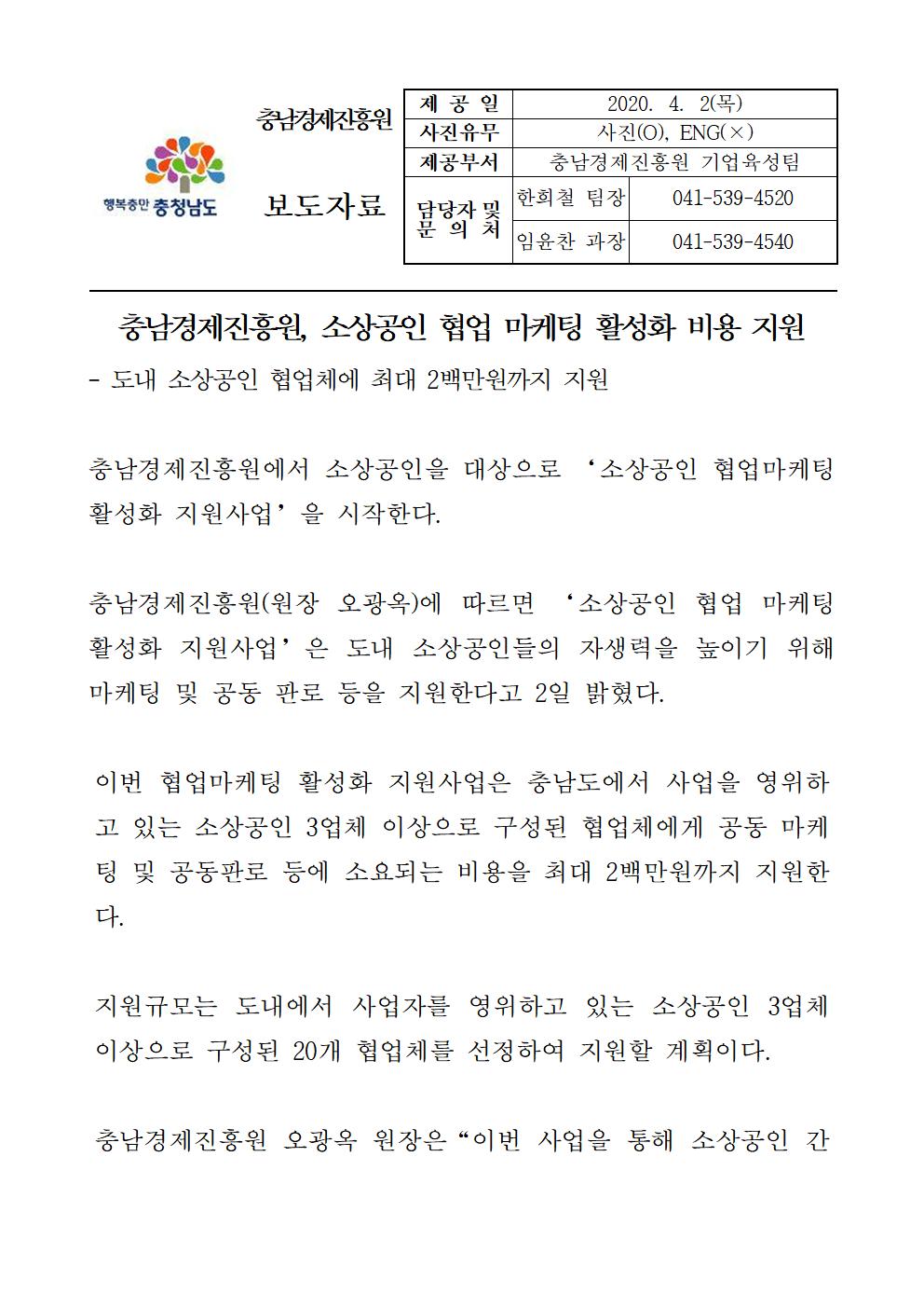 | 충남경제진흥원, 소상공인 협업 마케팅 활성화 사업 실시 [2020.04.01] | |||