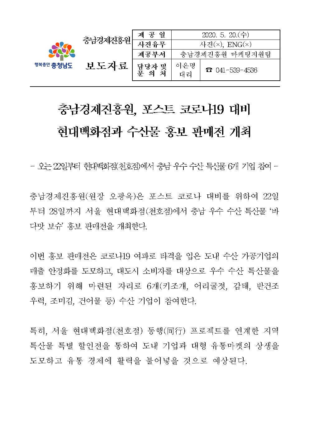 | 충남경제진흥원, 포스트 코로나19 대비 현대백화점과 수산물 홍보 판매전 개최 | |||