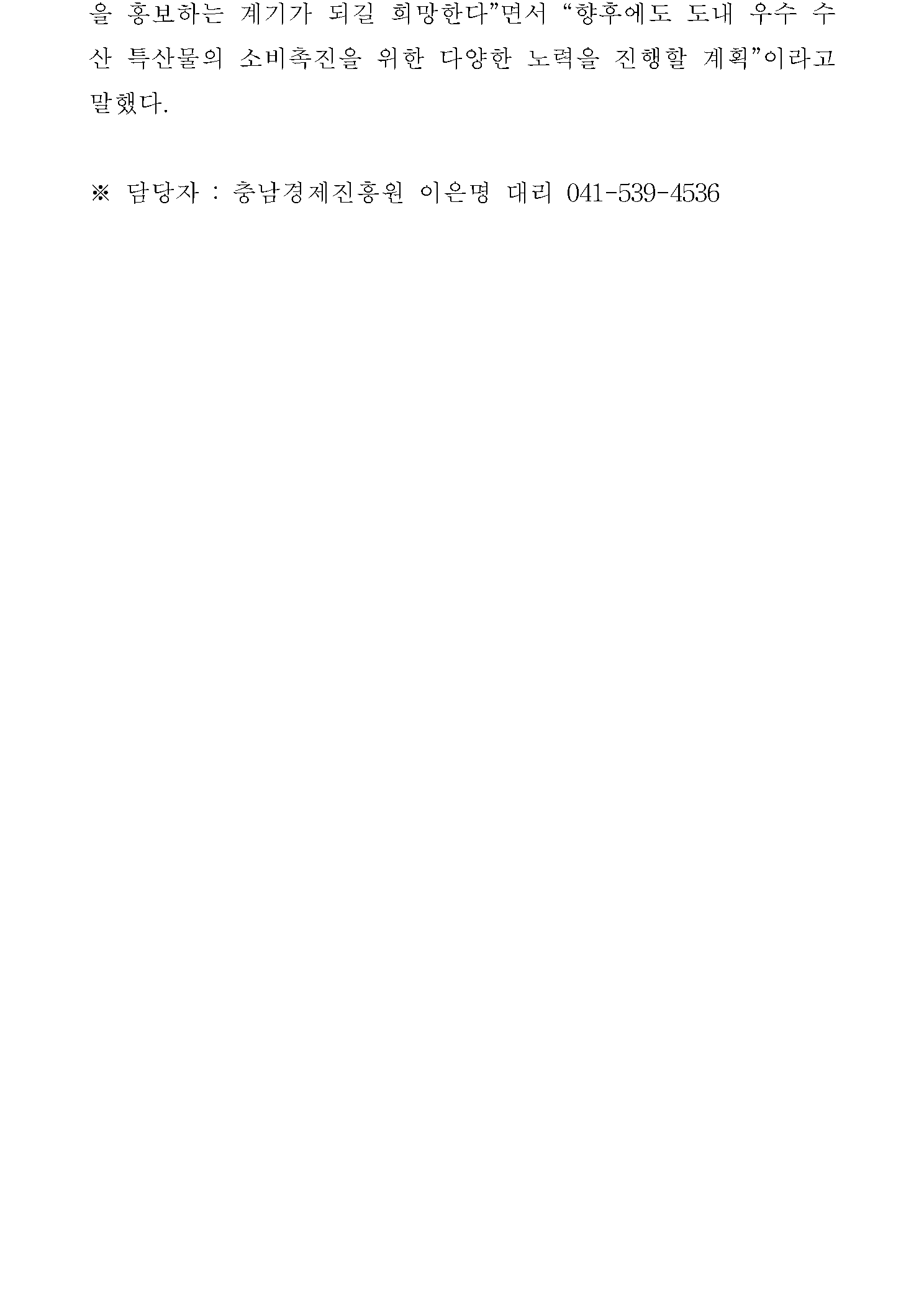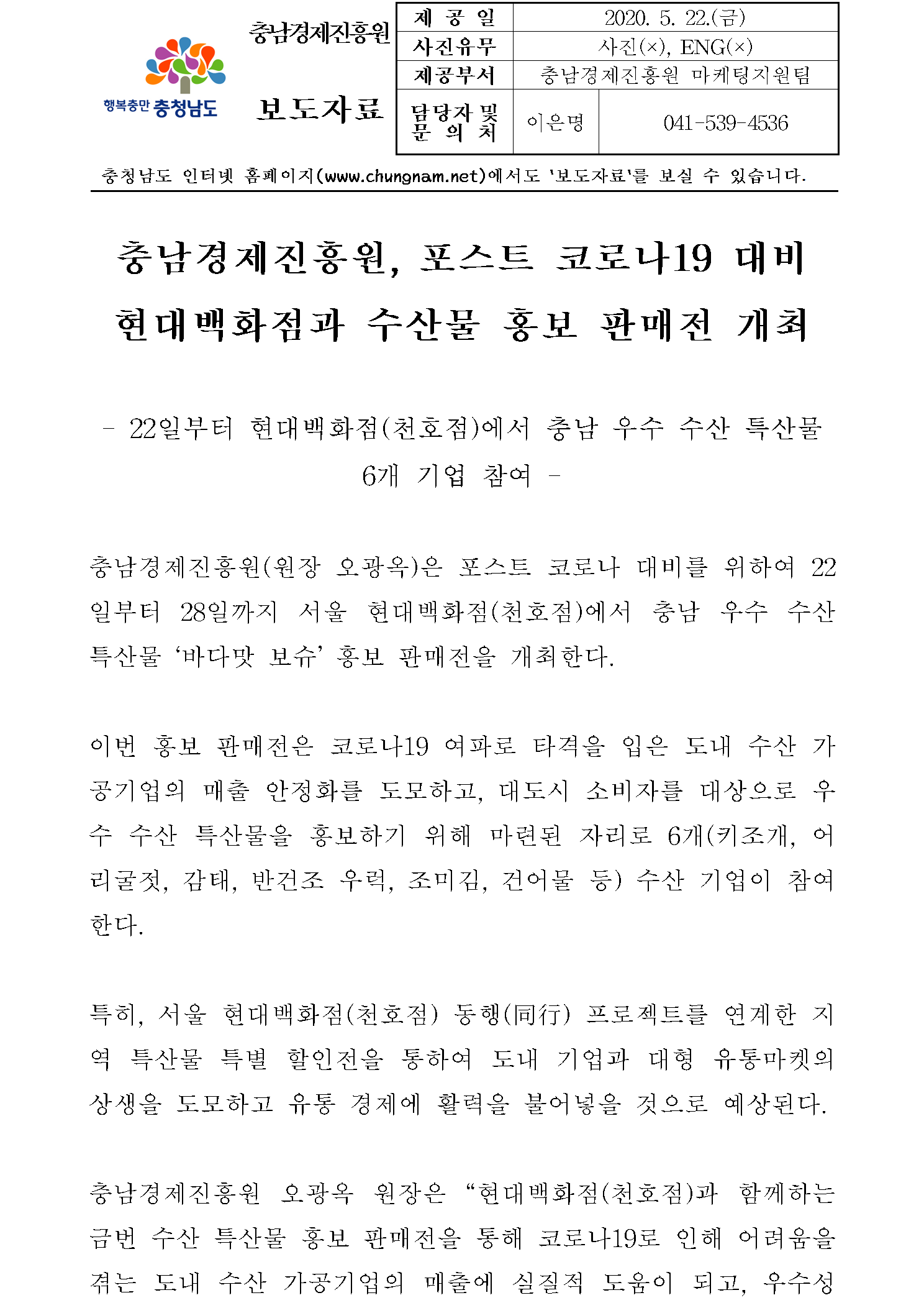 | 충남경제진흥원, 현대백화점과 함께하는 충남 수산 특산물 홍보 판매전 개최 [2020.05.22.] | |||