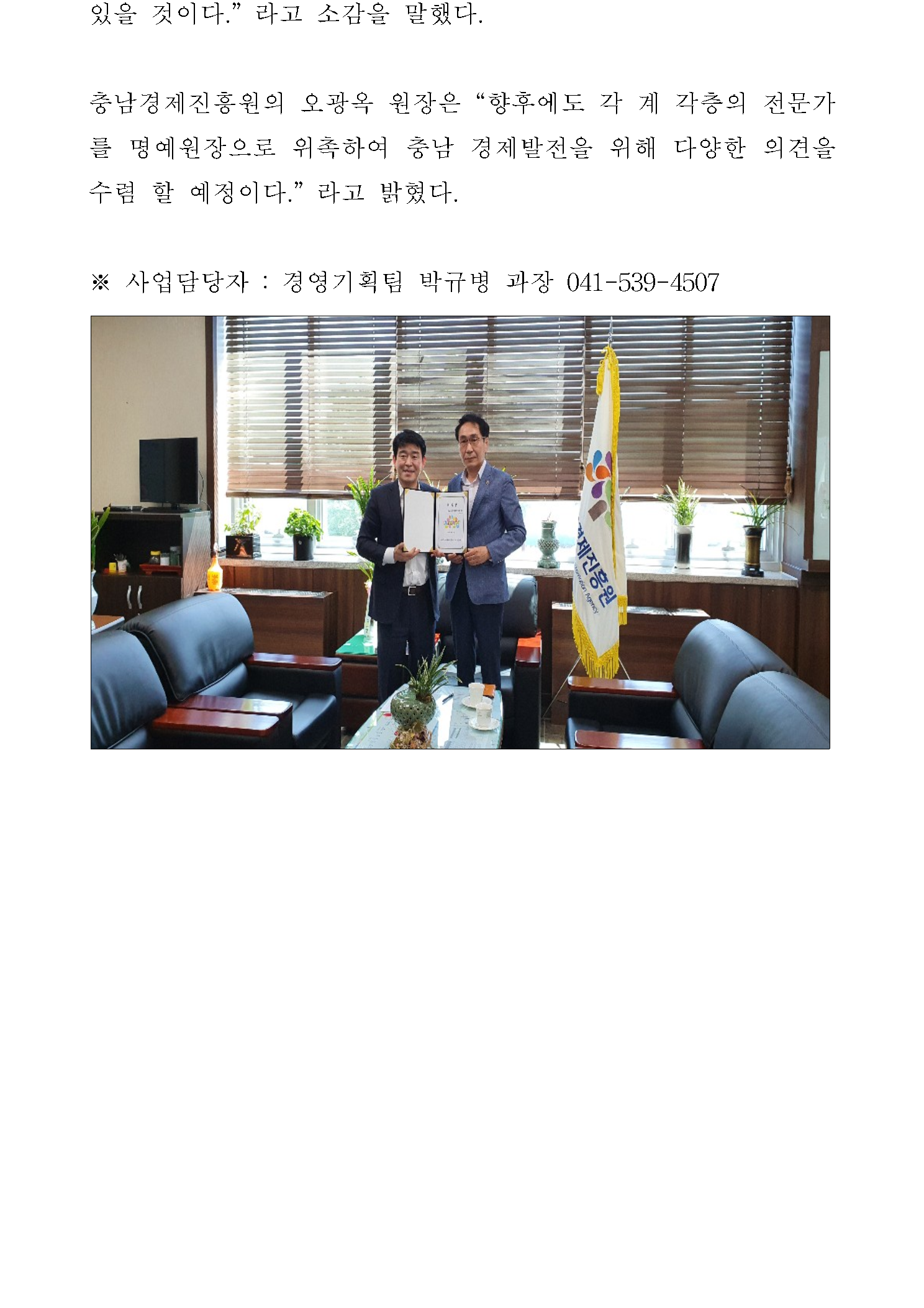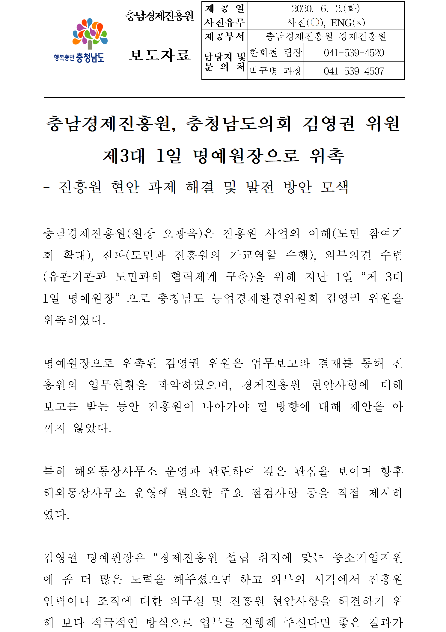 | 충남경제진흥원 충남도의회 김영권 위원, 제 3대 1일명예원장으로 위촉 [2020.06.01.] | |||