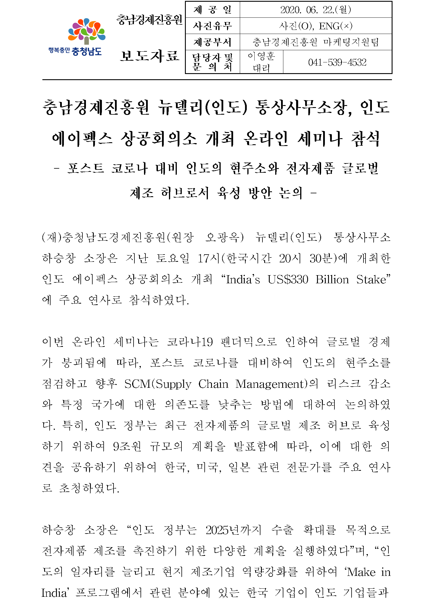 | 인도·베트남 시장 진출, 이제 충청남도 해외 통상사무소과 함께하세요 [2020.06.22.] | |||