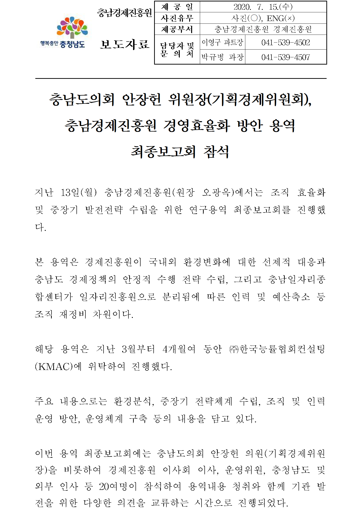 | 충남도의회 안장헌 위원장, 충남경제진흥원 경영효율화 방안 용역 최종보고회 참석 [2020.07.15.] | |||