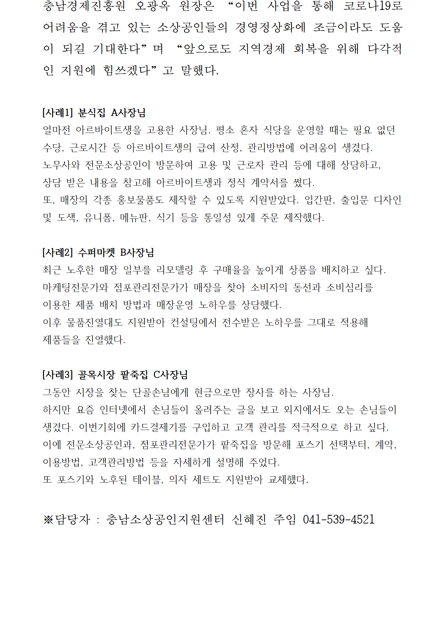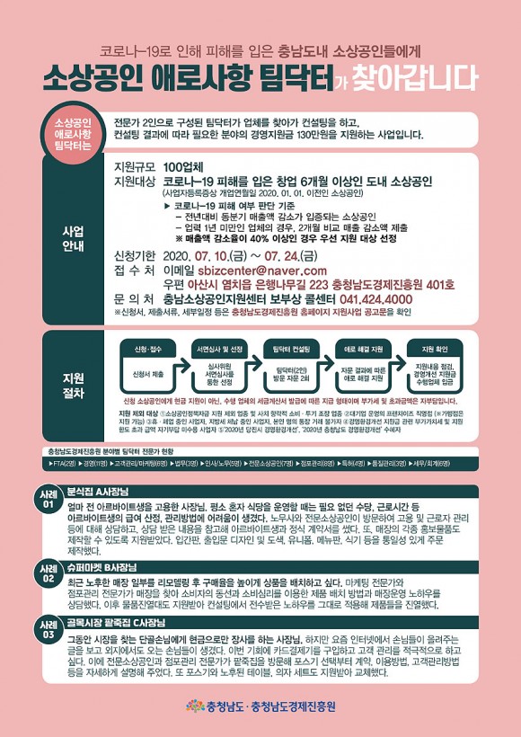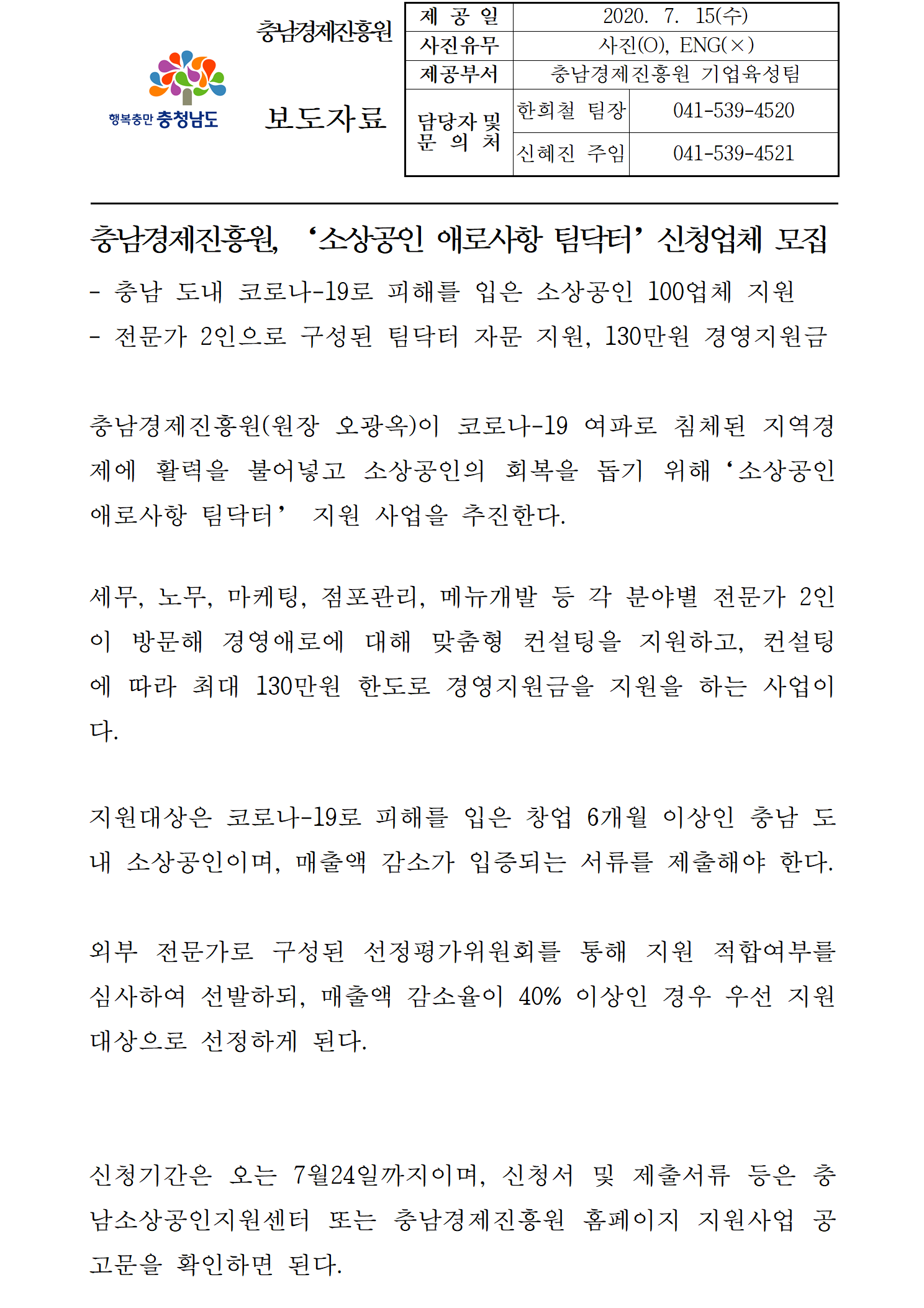 | 충남경제진흥원, ‘소상공인 애로사항 팀닥터’신청업체 모집 [2020.07.16.] | |||