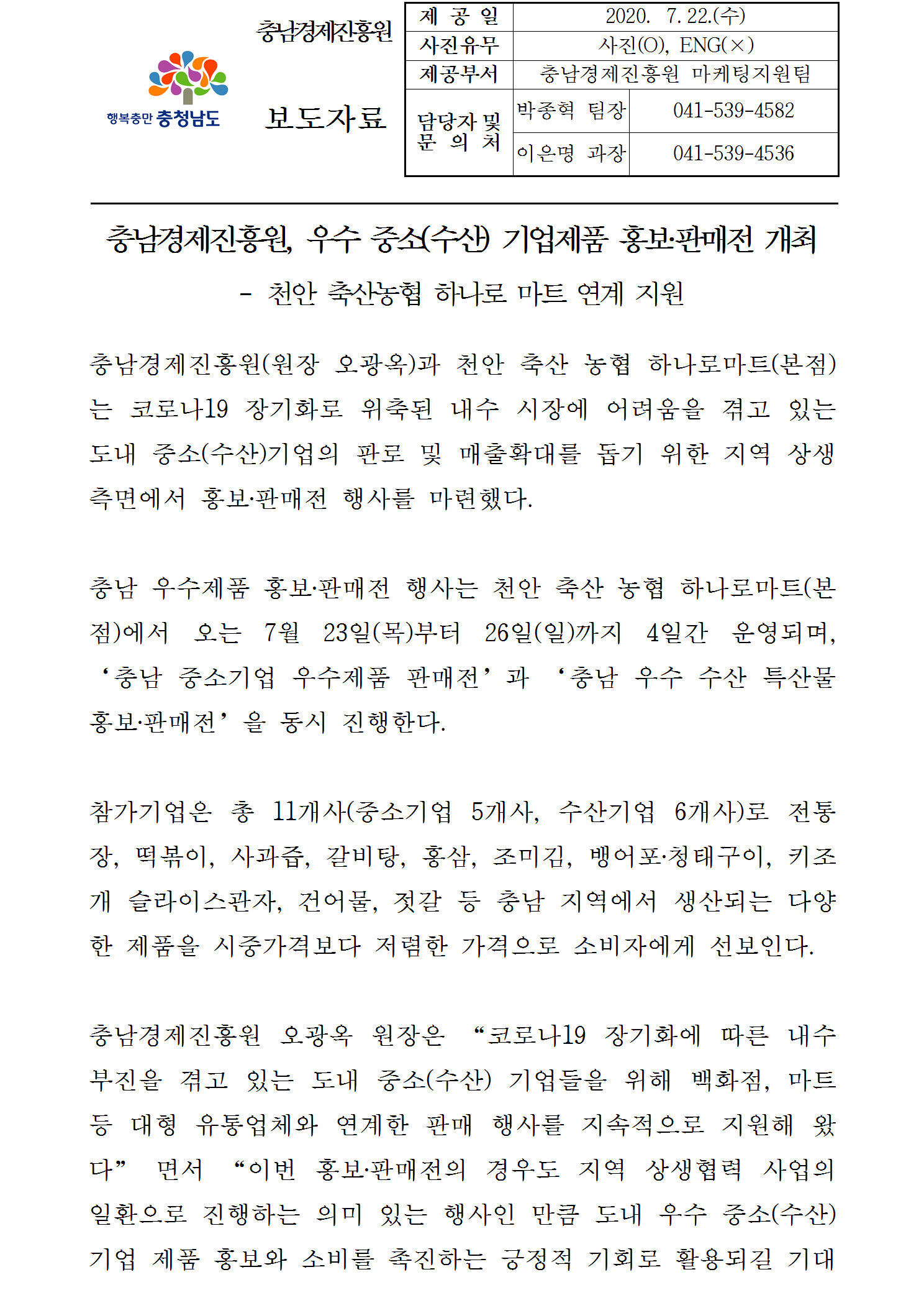 | 충남경제진흥원, 우수 중소(수산) 기업 제품 홍보 판매전 개최 [2020.07.22.] | |||