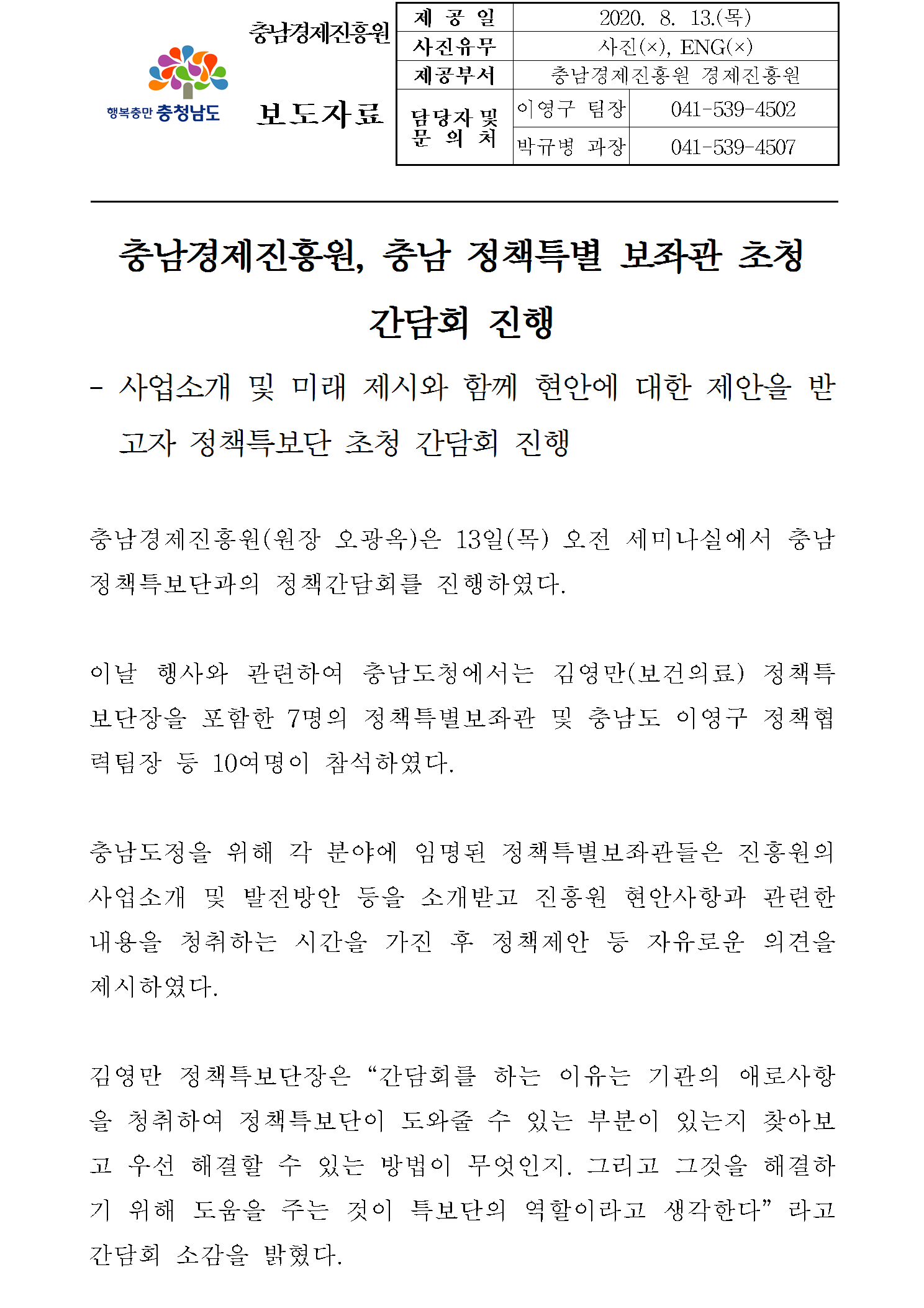 | 충남경제진흥원, 충남 정책특보단 초청 간담회 실시 [2020.08.13.] | |||