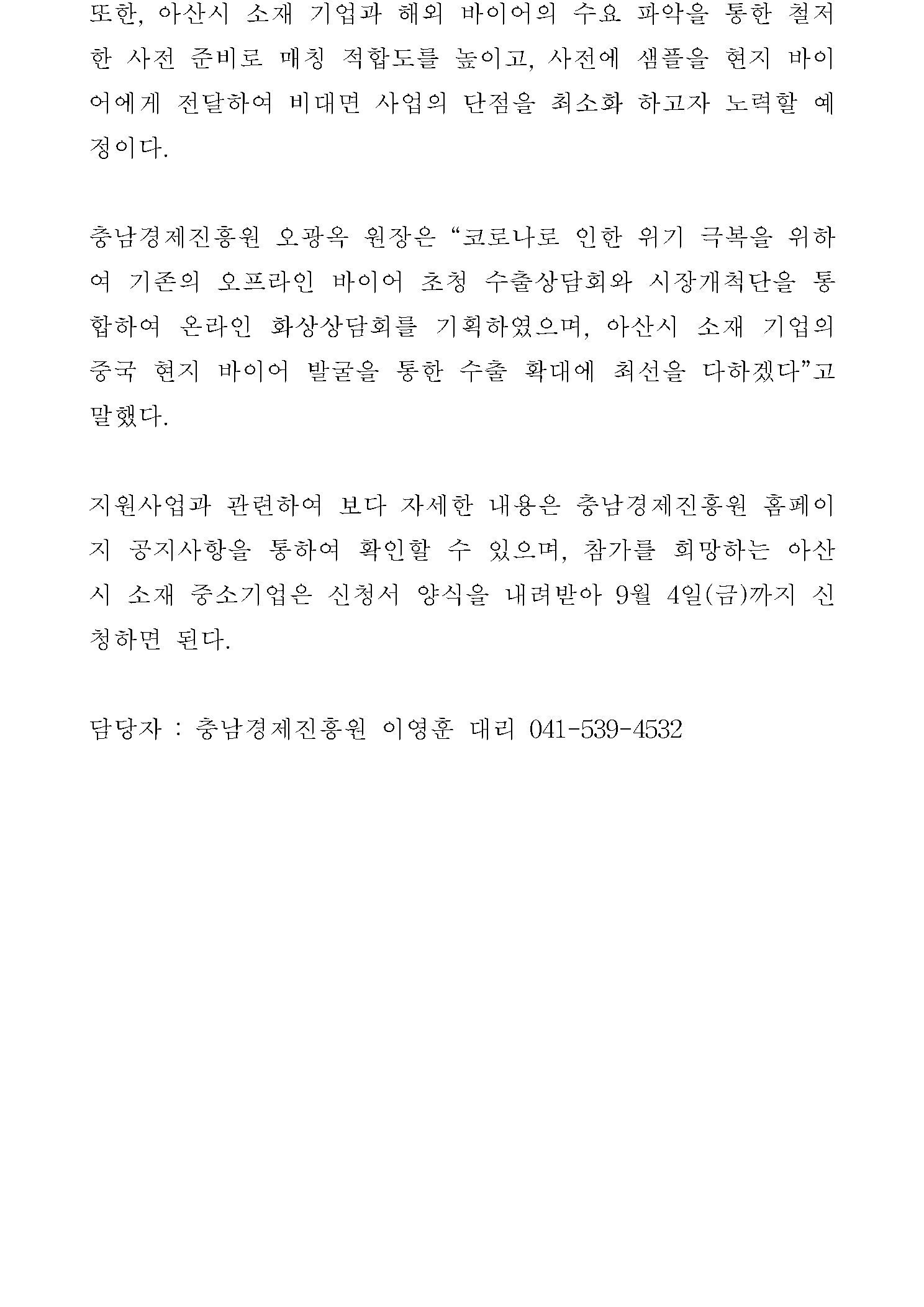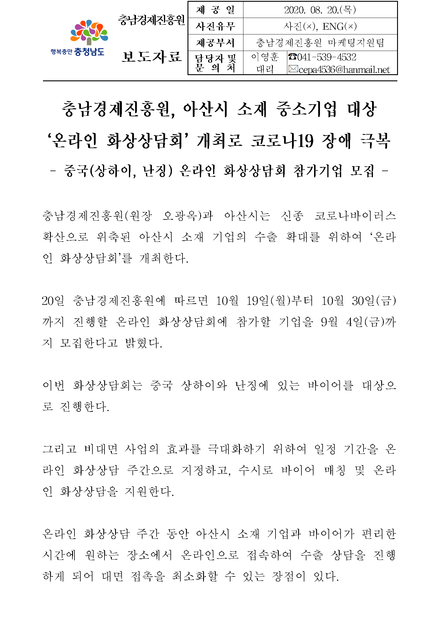 | 충남경제진흥원, 아산시 소재 기업 대상 온라인 화상상담 참여기업 모집 [2020.08.20.] | |||