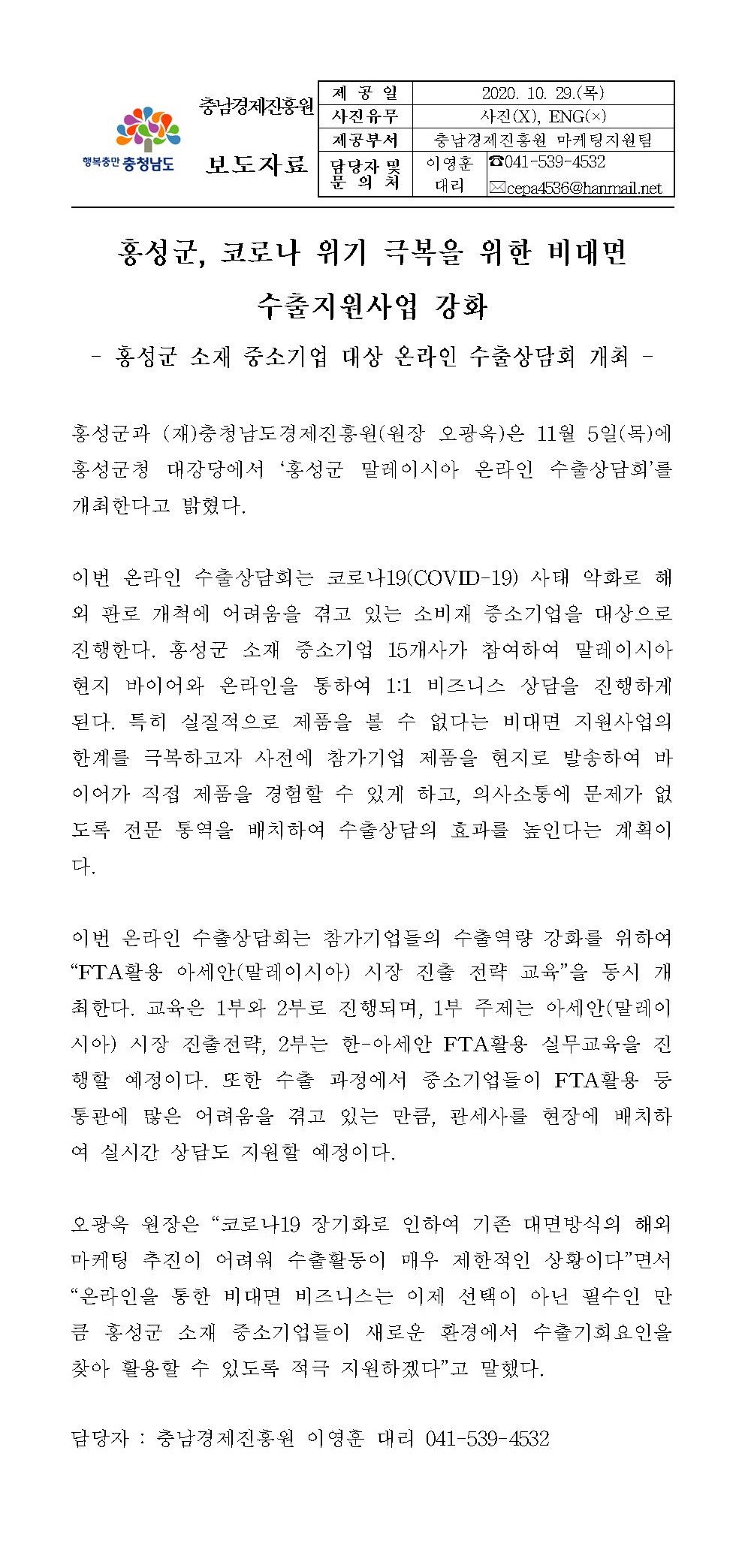 | 홍성군, 코로나 위기 극복을 위한 비대면 수출지원사업 강화 [2020.10.29.] | |||
