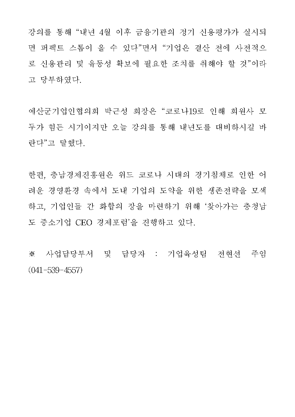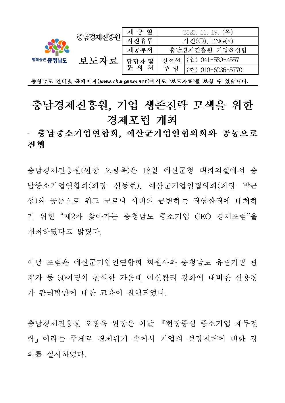 | 제2차 찾아가는 충청남도 중소기업 CEO 경제포럼 [2020.11.19.] | |||