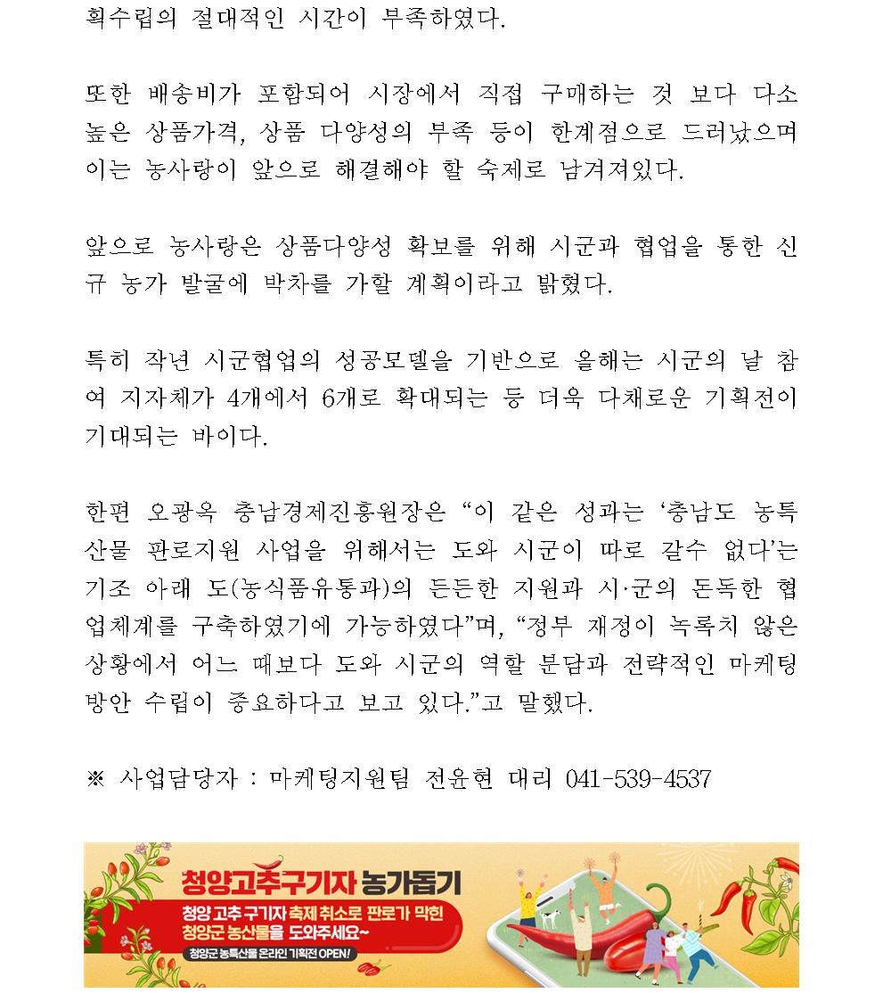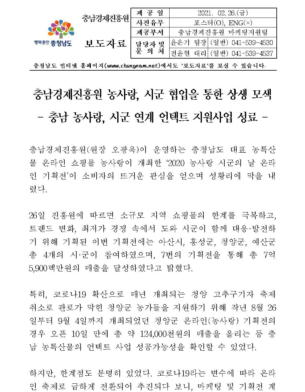 | 충남경제진흥원 농사랑, 시군 협업을 통한 상생 모색[2021.02.26.] | |||