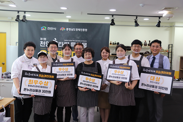 천안원도심에서 개최된 ‘제1회 천안특산물 요리경진대회’가 성대하게 막을 내렸다. 6월 26일 개최된 이번 행사는 충남경제진흥원(원장 오광옥)에서 천안 원도심 상권 르네상스 사업의 일환으로 천안특산물을 알리고 원도심에 활기를 불어넣고자 천안 원도심 내에 위치한 천안요리학원에서 개최되었다. 요리경진대회는 KBS 개그맨 엄태경의 사회로 진행되었으며 심사위원으로는 한식대첩3 충남대표였던 명지대 교수 겸 천안요리학원 원장인 김선희 교수, 우송대 박경심 교수와 함께 천안에서 이봉원의 봉짬뽕을 운영중인 개그맨 이봉원이 심사를 맡았다. 이번 행사에 참가자들은 호두, 오이, 배, 거봉, 멜론, 순대 등 천안 특산물을 활용한 요리 메뉴를 개발해 참가하였다. 본선 심사에 참여한 17명의 참가자들은 각자 개발한 레시피를 선보였다. 요리의 맛, 조리과정의 전문성, 청결과 천안특산물을 얼마나 잘 활용하였는지와 레시피 활용성을 토대로 심사가 진행되었으며, 대상으로는 ‘호두 휘낭시에 그리고 카라멜 크림을 곁들인’을 선보인 김동한 청년(천안 입장면)이 수상하였다. 대상 수상자는 천안시장상과 함께 전통시장에서 쓸 수 있는 온누리상품권 50만원을 수여받았다. 이번 행사에 특별참가하기도 한 충남경제진흥원 오광옥 원장은 “참가자분들이 요리경진대회를 통해 천안 원도심에서 좋은 추억을 만들 수 있었으면 좋겠다. 천안원도심은 이처럼 맛과 멋과 추억이 있는 공간이다.”며 “천안역을 통해 전국 어디서나 오실 수 있는 곳인만큼 많은 분들이 천안원도심을 찾고 즐겨주셨으면 좋겠다.”고 밝혔다.경진대회는 충남경제진흥원 유튜브 채널을 통해 송출되었으며, 충남경제진흥원 유튜브를 통해 다시 볼 수 있다.