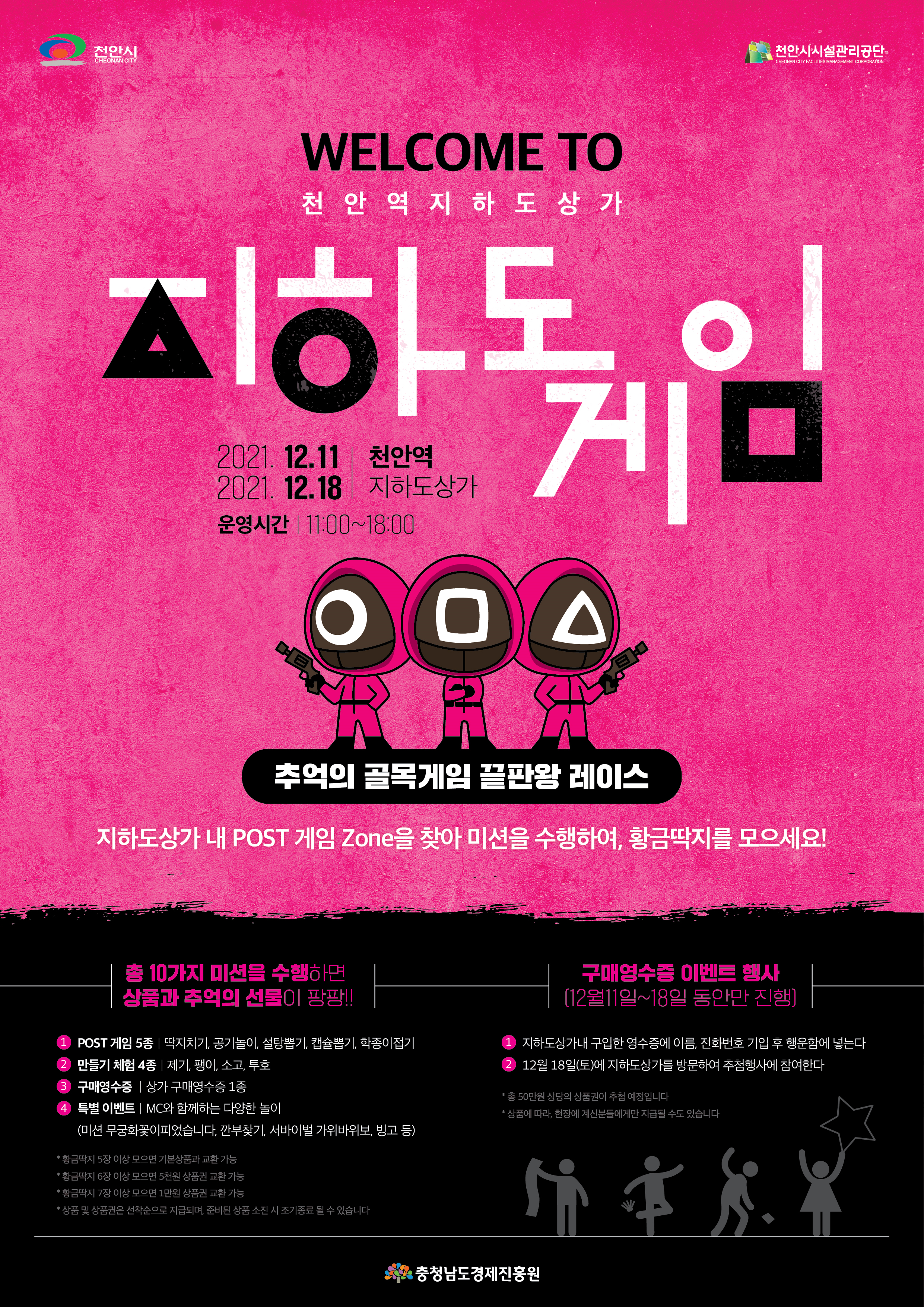 충남경제진흥원(원장 오광옥)에서 운영하는 천안상권활성화기구와 천안시, 천안역 지하도상가 상인회에서 ‘천안역 지하도 상가 지하도 게임’을 진행한다. 이는 전 세계적으로 인기를 얻고 있는 넷플릭스 드라마 ‘오징어게임’을 모티브로 한 시민 참여형 행사로 오는 12월 11일(토), 18(토) 2회에 걸쳐 천안역 지하도 상가에서 진행된다. 이번 ‘지하도 게임’ 행사는 시민들이 직접 체험할 수 있는 프로그램을 통해 단계적 일상 회복(위드코로나)과 함께 시민들의 삶에 재미와 활력을 불어넣고, 더불어 코로나19로 침체되어 있던 천안역 지하도 상가를 활성화시켜보고자 기획된 행사이다. 천안역 지하도 상가 전 지역에 숨겨져 있는 POST 게임존을 찾아 게임에 참가하고, 우승시 ‘황금딱지’를 획득하게 된다. 획득한 황금딱지는 수량에 따라 별도 마련된 운영본부에서 선물로 교환할 수 있으며, 많은 시민들에게 선물을 제공할 예정이다. 또한 코로나 방역 지침에 따라 시간대별 참가 인원을 제한하고, 게임존 내 방역 물품 비치 및 주기적인 소독 등 철저한 방역을 통해 안전한 행사가 될 수 있도록 만전을 기할 예정이다. 충남경제진흥원 오광옥 원장은 “추억의 장난감들을 직접 만들 수 있는 체험존, 추억의 미니 오락기 및 문방구 게임 등 무료로 즐길 수 있는 프로그램들도 다채롭게 마련되어 가족들과 함께 즐겁고 따뜻한 주말을 보낼 수 있도록 기획하였다.”고 이번 행사의 취지를 밝혔다. 천안역 지하도 상가 서웅경 회장은 “이번 행사를 통해 천안역 지하도 상가를 찾는 방문객들은 잊지 못할 추억과 즐거움을 쌓는 시간을 갖고, 상인들에게는 신나는 음악과 많은 사람들로 북적이던 상가의 일상을 회복할 수 있는 발판이 마련되기를 기대해 본다.”고 말했다.