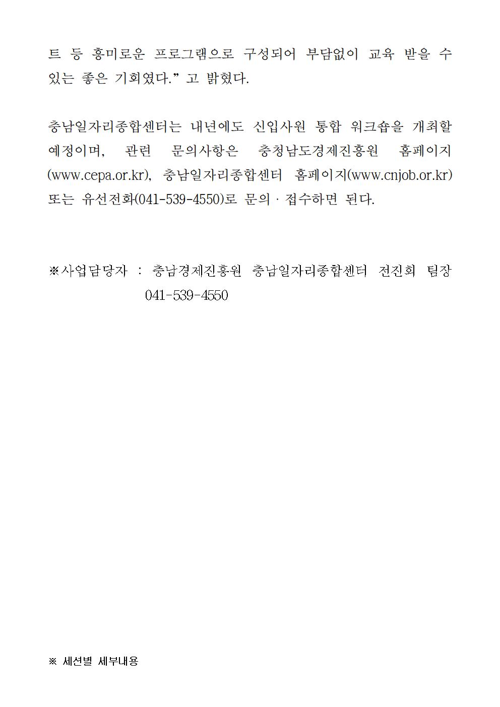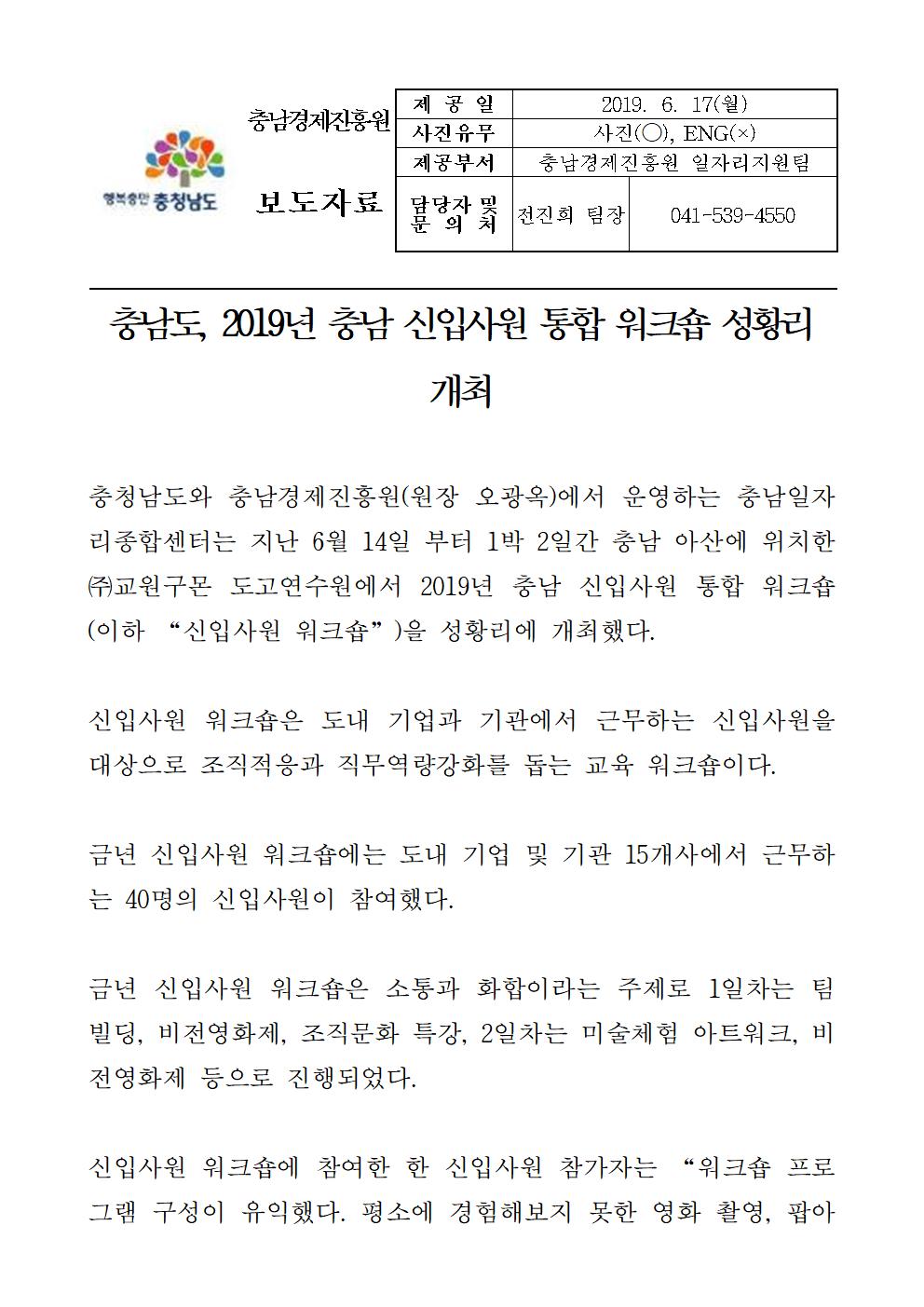 | 충남경제진흥원, 2019년 충남 신입사원 통합 워크숍 성황리 종료 [2019.06.17] | |||
