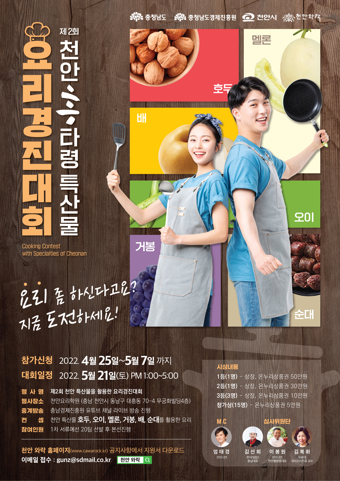 충남경제진흥원(원장 오광옥)에서 천안 원도심 상권 활성화를 위한 요리대회를 2021년에 이어 금년에도 진행한다. “제2회 천안 흥타령 특산물 요리경진대회”는 천안시와 충남경제진흥원, 천안상권활성화기구가 공동으로 주관하며 천안 특산물인 호두, 오이, 멜론, 거봉, 배, 순대 등을 활용한 요리 비법을 발굴·활용하기 위한 대회이다. 1차 서류예선으로 20팀을 선발해 5월 21일 오후 1시부터 5시까지 천안요리학원(천안시 동남구 대흥동 70-4 무궁화빌딩4층)에서 본선을 진행한다. 대한민국 국민 누구나 참여 할 수 있는 이번 요리경진대회는 KBS 개그맨 엄태경이 사회를 맡아 충남경제진흥원 유튜브 채널로 라이브 방송한다. 심사위원으로는 명지대학교 교수이자 한식대첩3 충남대표였던 김선희 원장, 이봉원의 봉짬뽕 대표인 개그맨 이봉원, 우송대 김복화 교수이다. 대회 입상자들에게는 상장과 함께 온누리 상품권을 부상으로 증정한다. 참가신청은 오는 5월 7일까지 접수하고 접수는 '천안와락' 홈페이지 공지사항에서 지원서를 내려 받아 이메일로 제출하면 된다. 참가비는 무료이고 요리경진대회에 필요한 식재료를 무료로 제공한다. 행사와 관련된 자세한 내용은 충남경제진흥원 홈페이지(www.cepa.or.kr) 및 천안와락 홈페이지(www.cawarock.kr), 충남보부상콜센터를 통해 확인할 수 있다.