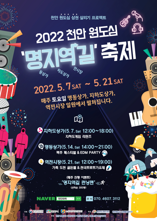 천안시와 충남경제진흥원(원장 오광옥), 천안원도심활성화기구에서 “2022년 천안 원도심 명지역길 축제”를 진행한다. 가정의 달을 맞이해 5월 한 달 동안 3회에 걸쳐 천안 원도심에서 토요일마다 도심 속 색다른 휴가를 즐길 수 있는 다양한 행사가 열린다. 이번 축제는 천안명동상가·천안역지하도상가·천안역전시장 상인회, 대한노인회 천안시지회에서 후원하는 행사로 천안 원도심을 중심으로 펼쳐지며, 천안 원도심 상권 활성화의 일환으로 마련되었다. “명지역길 축제”는 명동상가, 지하도상가, 역전시장을 무대로 5월 7일, 14일, 21일 총 3회 실시된다. 코로나19 이전의 일상을 추억하며 가족, 또는 친구들과 함께 흥겹고 즐거운 거리 축제 문화를 즐겨볼 수 있도록 다채롭게 구성되었다. “명지역길 축제”는 5월 7일(토) 지하도상가에서 펼쳐지는 ‘지하도게임 리턴즈’를 시작한다. 이어 14일(토)에는 명동상가에서 ‘맥주축제&EDM 파티’를, 21일(토)에는 역전시장에서의 ‘전국 트로트 가요제’를 끝으로 뜻깊은 축제를 마무리하게 된다. 부대행사로 5월 14일(토)에 명동공원(명동상가 인근)에서 실시되는 ‘제1회 명지역길 어린이 사생대회’, 21일(토)에는 역전시장 메인 무대에서 펼쳐지는‘명지역길 가족 도전 골든벨 대회’, 그리고 청년 버스킹 공연, 버블아트쇼, 플리마켓, 제2회 천안 흥타령 특산물 요리경진대회 등 다채로운 프로그램을 통해 행사장을 찾는 분들께 푸르른 5월의 즐거움을 선사할 예정이다. 이번 “명지역길 축제”를 통해 천안 원도심의 활기찬 분위기가 지속적으로 이어져 원도심의 상권이 활성화되기를 바라며, 더불어 코로나19로 인해 지쳐있던 시민들에게 활기를 불어넣고 행복했던 일상으로 되돌아갈 수 있는 희망을 찾는 기회가 되기를 기대해 본다.