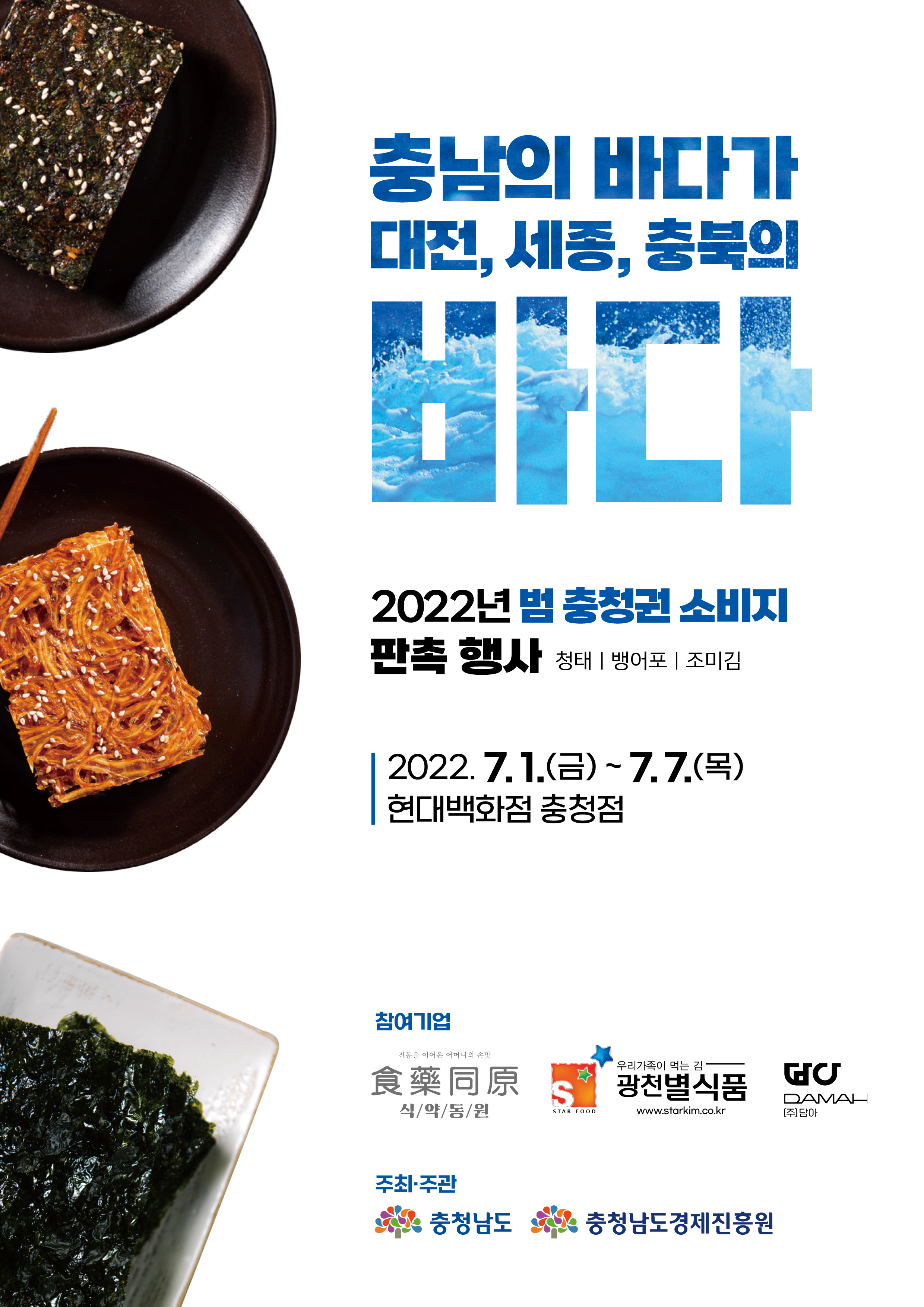 충남경제진흥원(원장 오광옥)이 1일부터 7일까지 충남 수산물 판매전을 개최한다고 밝혔다. 현대백화점 충청점(충북 청주)에서 개최되는 이번 판매전은 충남 서해 바다의 우수한 수산물을 충북 소비자들에게 합리적인 가격에 선보인다. 판매전에 선보이는 충남 수산물은 △(주)광천별식품(숯불김, 파래김, 조미김 등) △식약동원(뱅어/청태 양념구이 등) △(주)담아(김스낵, 스틱자반, 돌김 등)이다. 판매전은 오전 10시부터 오후 8시까지 진행한다. 충남경제진흥원 오광옥 원장은 “이번 판매전을 통해 충남에서 생산된 우수 수산물을 충북 시민들에게 널리 알려 소비촉진 기회를 마련하는 한편, 충남 지역 수산물 직거래 활성화를 통해 판로를 확대하는 계기가 되기를 기대한다.” 고 밝혔다.