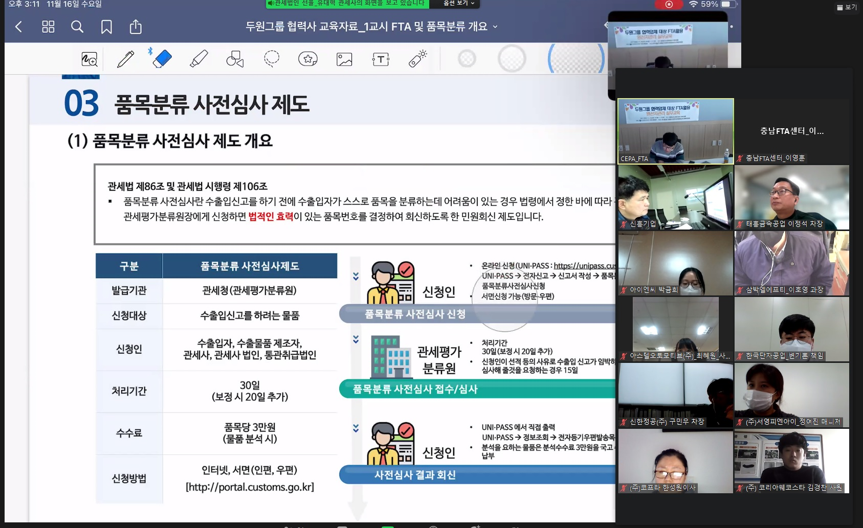 충남경제진흥원(원장 오광옥)에서 운영하고 있는 충남FTA활용지원센터는 충남지역 자동차 부품제조사의 수출경쟁력 강화를 위하여 두원그룹 협력업체 대상 FTA활용 실무교육을 11월 16일(수) 온라인으로 개최하였으며, 57명(54개사)가 참여하였다. 이번 교육은 관세법인 선율 유대혁 관세사를 초청하여 ▲ 원산지결정 기준 이론 및 판정연습, ▲ 품목분류 이론 및 사례, ▲ 원산지증빙 서류 보관 관리규정 등을 중심으로 진행하였다. 특히, 이번 교육은 원산지관리 전담자 지정 점수 6점을 받을 수 있어 인증수출자를 신규 취득하거나 갱신하는 기업들에게도 유용할 것으로 기대된다. 충남경제진흥원 오광옥 원장은 “충남의 자동차 산업은 반도체와 더불어 고용 등 도내 경제에서 차지하는 비중이 매우 크다”라며, “자동차 부품 제조사들이 충남FTA활용지원센터를 통하여 한 단계 더 도약할 수 있도록 차년도에도 다양한 정책을 추진해 나가겠다”라고 말했다. 충남FTA센터에서는 FTA활용 실무교육을 매월 정기적으로 개최하고 있으며, 12월 7일과 8일에는 베트남 시장 진출 전략교육과 한-이스라엘/한-캄보디아 FTA활용 설명회가 순차적으로 개최될 예정이다. 자세한 내용은 충남FTA센터 담당자(☎ 041-539-4591)에게 문의하거나 충남경제진흥원 홈페이지(www.cepa.or.kr)를 통하여 확인 가능하다.