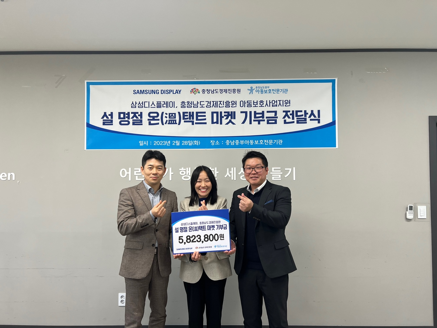 충남경제진흥원에서 운영중인 농사랑 쇼핑몰(www.nongsarang.co.kr)은 지난 2월 28일 도내 학대 피해 아동 및 가족들의 육체심리적 치료를 위한 기부금 582만원을 충청남도중부아동보호전문기관에 전달했다고 밝혔다. 이번 후원금은 도내 농가들의 온라인 판로 지원을 위해 진행한‘2023년 농사랑 설 명절 기획전’기부행사 수익금으로 마련됐다. 기획전 참여 농가가 매출액의 일정 금액을 자발적으로 기부하고 삼성디스플레이 및 임직원들도 동참해 의미를 더했다. 이번 기부행사에 참여한 농가는 △아침농원 △한산소곡주 호암제조소 △강산소곡주 △반촌영농조합법인 △게으름벵이농장 △바우농원 △한아름딸기협동조합 △한우드소 △한우지애 △부여은산착한표고농원 △세계로씨푸드 △인주푸드 △식약동원 △강경포구젓갈 △어사새싹샘 등 15개사이다. 충남경제진흥원 이영구 경영전략실장은 “기부에 적극적으로 참여해준 농사랑 입점 농가와 삼성디스플레이 관계자분들에게 감사한 마음을 전하면서 지속적인 사회공헌 활동으로 지역사회에 따뜻한 마음을 전하겠다”고 말했다. 김걸중 삼성디스플레이 사회공헌단 그룹장 역시 “이런 뜻깊은 행사에 참여하게 되어 기쁘다”며 “앞으로도 이런 기회를 통해 지속적인 사회적 선순환을 만들었으면 한다”고 말했다. 강은정 관장도 “학대 피해 아이들에게 보내주신 많은 관심과 후원에 감사드린다”며 “보내주신 기부금이 의미 있는 곳에 쓰이도록 최선을 다하겠다”고 말했다. 한편 충남경제진흥원과 삼성디스플레이는 2021년 추석 이후 지속적으로 학대피해 아동 보호에 힘써오고 있다. 기존 전달된 기부금은 위기가정 긴급 생활 지원 키트 지급, 피해아동 심리검사 및 치료 등에 사용 되었으며, 추후 지원 범위를 확대하여 피해아동 집 설비 개선, 아동학대 재발 예방교육 등에도 활용 될 예정이다.