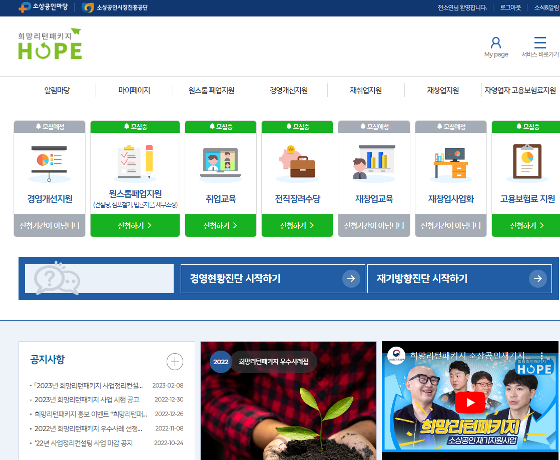 (사진설명: 소상공인진흥공단 희망리턴패키지 전용 페이지 http://hope.sbiz.or.kr) |