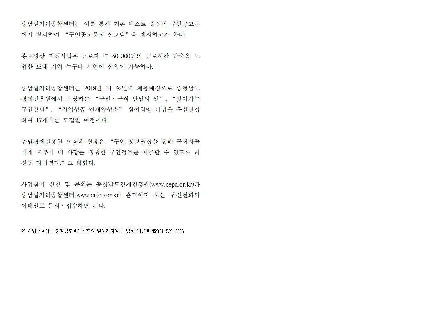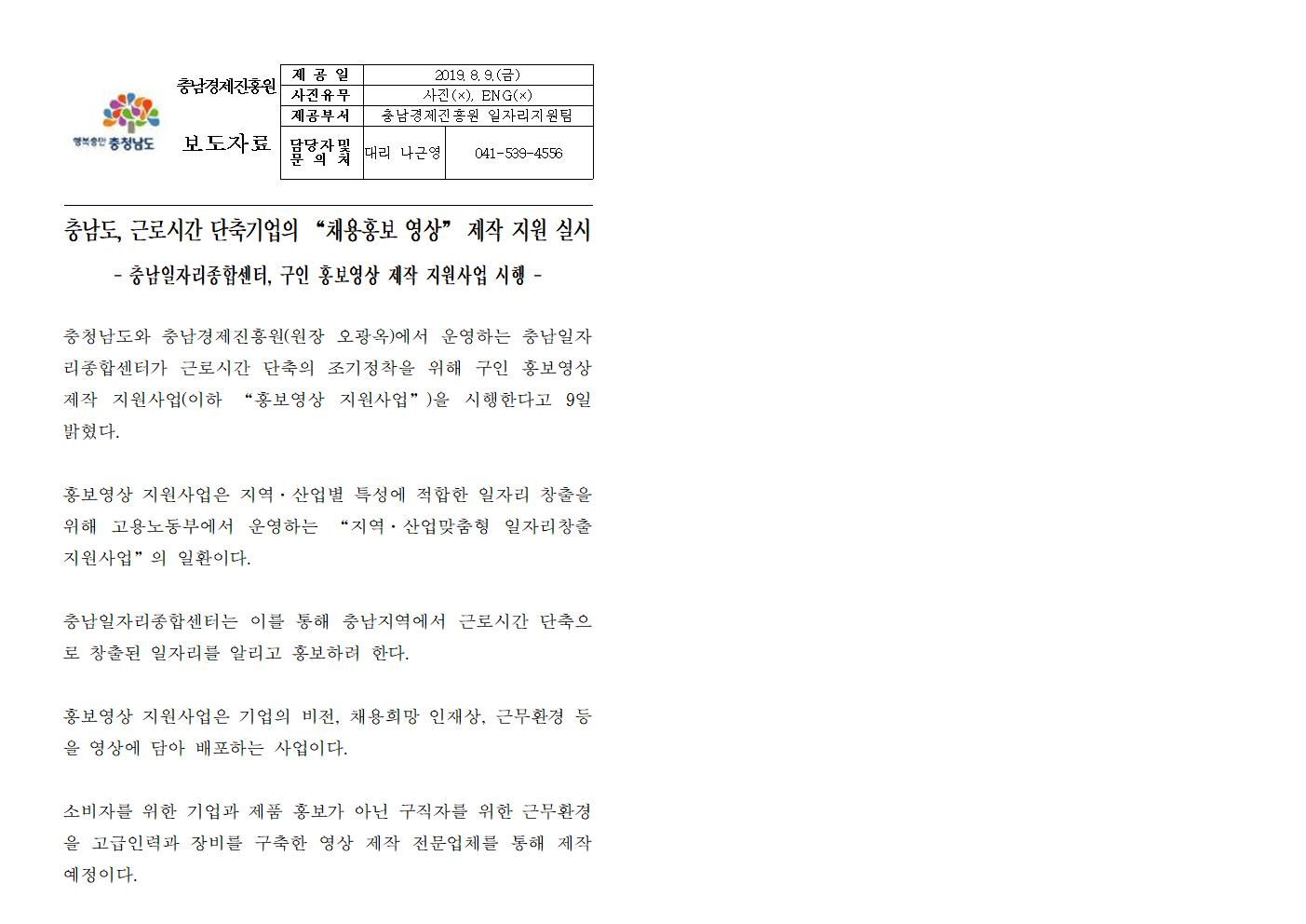 | 충남도, 근로시간 단축기업의 채용홍보 영상 제작 지원 실시 [2019.08.09] | |||