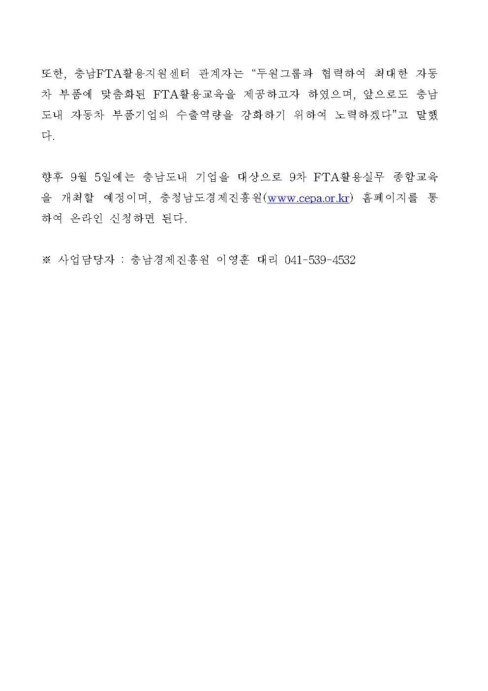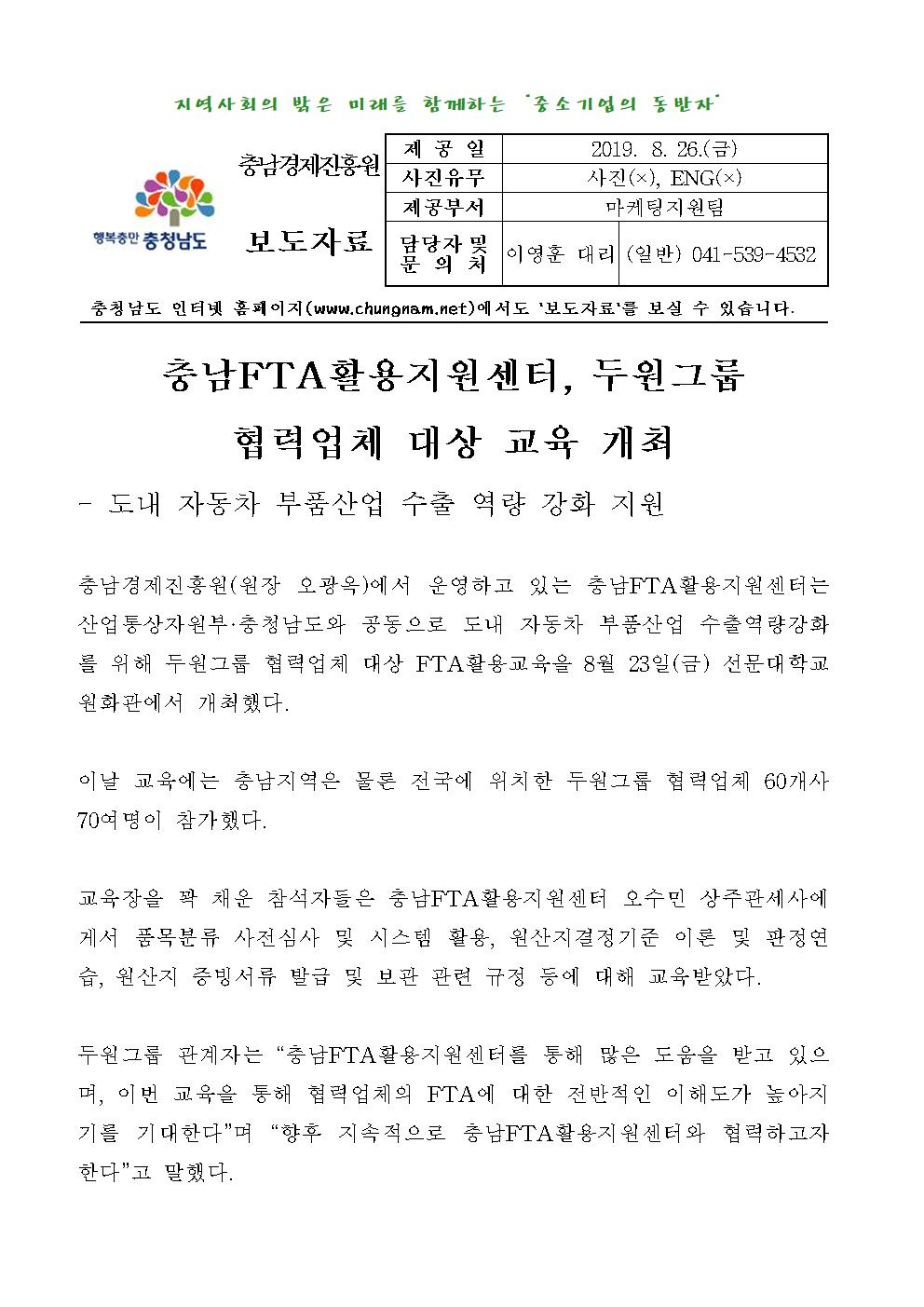 | 충남경제진흥원, 충남FTA활용지원센터 두원그룹 교육 실시 [2019.08.26] | |||