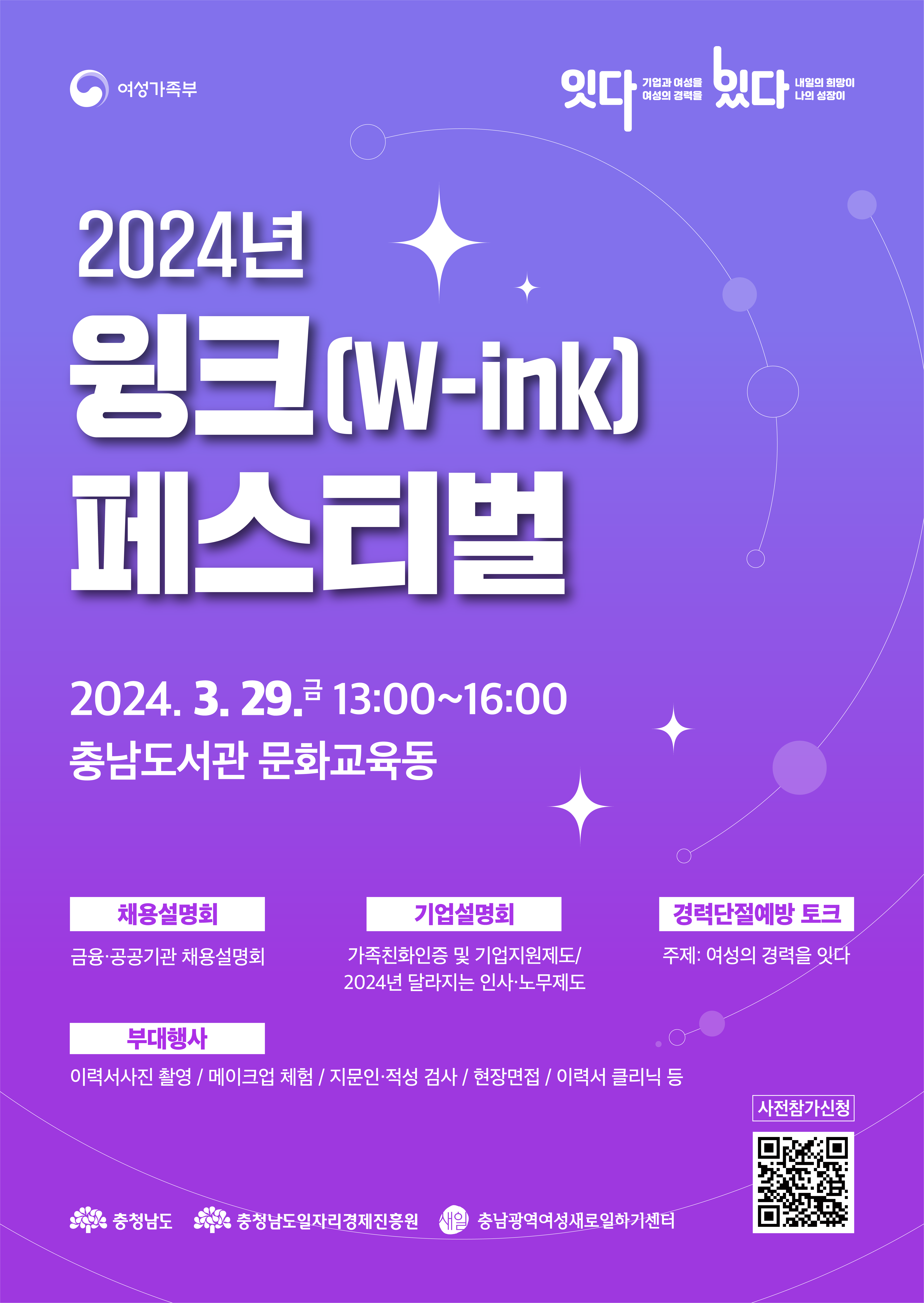 (재)충청남도일자리경제진흥원(원장 김찬배) 내 충남광역여성새로일하기센터는 3월 29일(금) 오후 1시 충남도서관 문화교육동에서 「2024년도 충남 윙크(W-ink) 페스티벌」을 개최한다. 관계자는 “경력단절 예방을 위한 인식전환 및 가족 친화적 기업문화 정착을 위해 노력하겠다”라고 말했다. 행사 참석은 충남 도민이면 누구나 가능하며, 사전 등록 및 행사 문의는 충남일자리경제진흥원 여성고용지원팀(041-404-1433)으로 연락하면 된다. |