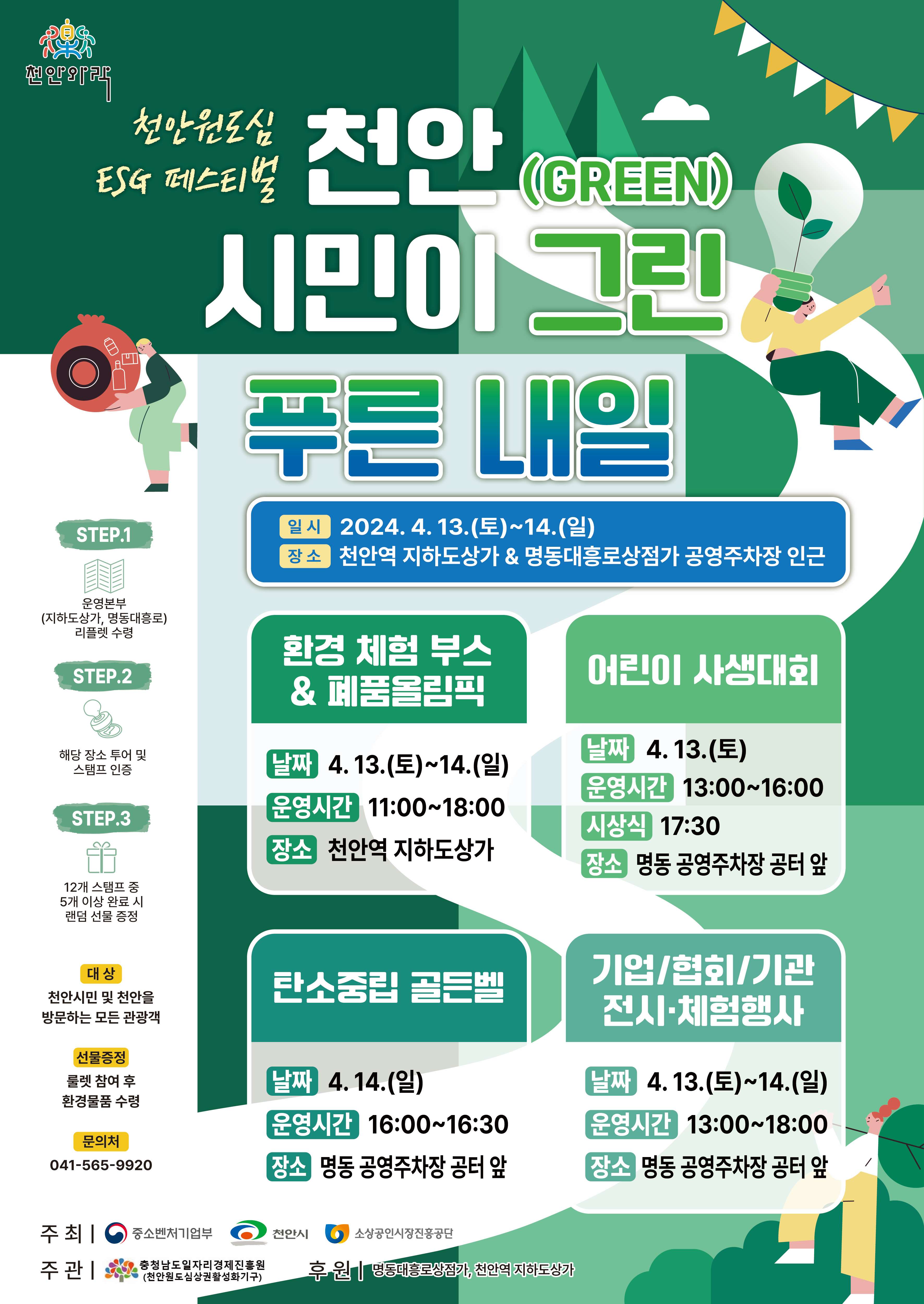 충남일자리경제진흥원(이하 진흥원) 상권활성화기구가 천안 원도심에서 환경 보호 메시지를 전하는 ESG 페스티벌로 시민들을 맞이한다. 진흥원은 오는 13일부터 14일 천안원도심 지하도상가와 명동대흥로 상점가에서‘천안 시민이 그린(GREEN) 푸른 내일’을 주제로 ESG 페스티벌을 개최한다고 밝혔다. 이번 행사는 체험부스, 사생대회, 골든벨, 플로깅 등 시민 참여형 활동으로 다채롭게 구성되어 환경 보호의 중요성을 알릴 계획이다. 행사장에는 커피 찌꺼기를 활용한 키링 만들기, 분재 심기, 제로웨이스트 샴푸바 제작 등 다양한 친환경 체험 부스가 마련된다. 또한, 어린이 사생대회와 환경 골든벨 등 이벤트를 통해 참가들에게 환경 문제에 대한 인식을 높이고, 탄소중립 실현을 위한 관심을 유도할 방침이다. 상권활성화기구 관계자는 “페스티벌이 단순한 축제를 넘어 시민들이 참여해 환경보호를 실천하고, 탄소중립에 기여하는 분위기를 조성하겠다”고 말했다. |