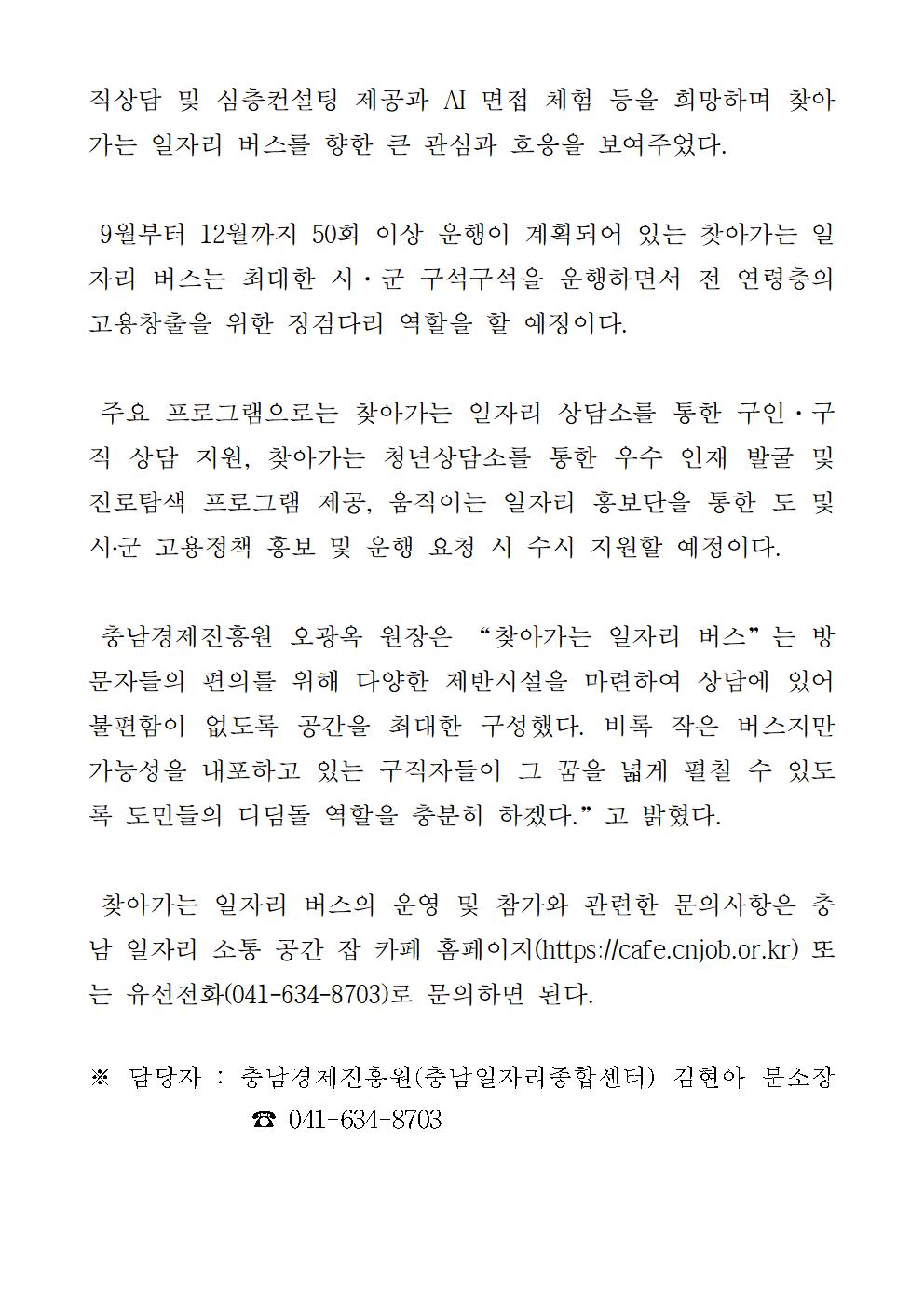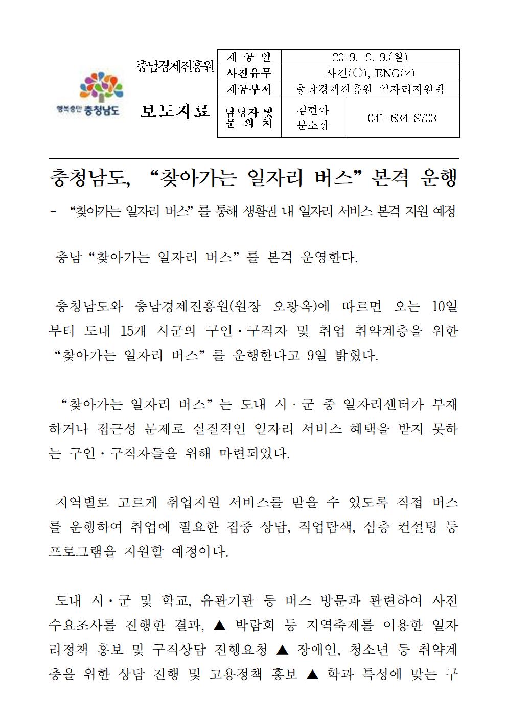 | 충남경제진흥원, 찾아가는 일자리 버스 운행 개시 [2019.09.09] | |||