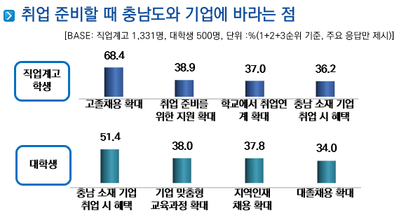 충남소재 기업 취업 선호도는 직업계고, “채용 확대”, 대학교“지역 기업 취업 시 혜택 강화” 필요