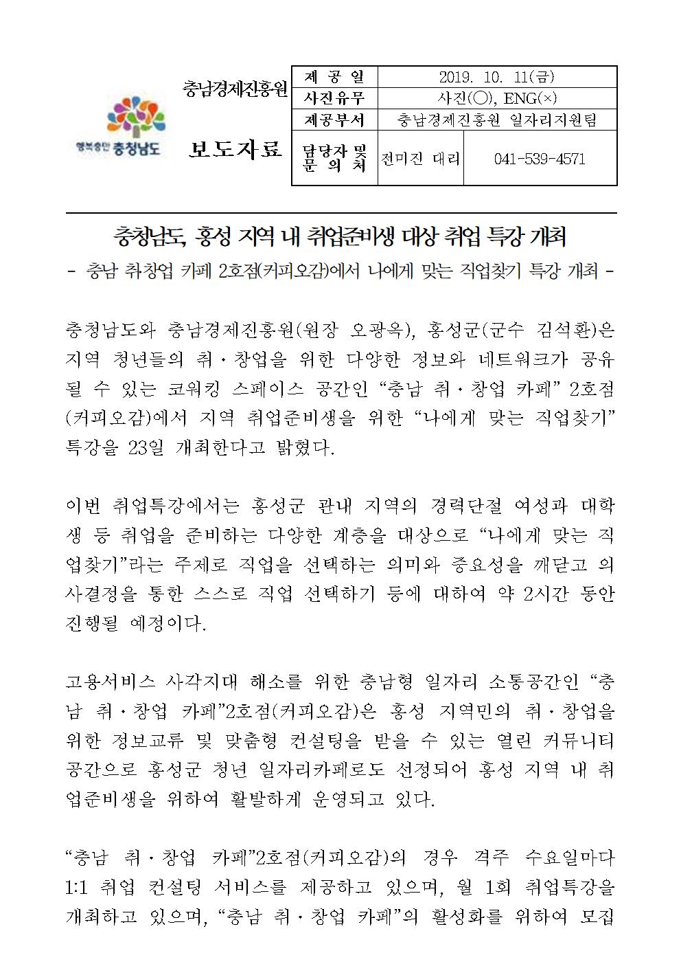 | 충남경제진흥원, 충청남도 홍성군과 함께 지역 내 취업준비생 대상 취업특강 개최 [2019.10.11] | |||