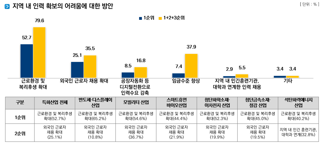 지역 특화 6대 산업 “내년 채용수요는 3,710명”으로 나타나 2025년 채용 수요는 모빌리티 산업에서 1,511명으로 가장 많아 ▲ 지역 내 인력 확보의 어려움에 대한 방안. 사진=충남경제진흥원 제공 충남경제진흥원(충남지역인적자원개발위원회)은 지역 특화 6대 산업을 선정해 충남 소재 기업 972개사를 대상으로 인력 및 교육훈련 심층 조사 결과를 발표했다. 충남지역인적자원개발위원회에서는 매년 인력 및 교육훈련 심층 조사를 추진하고 2024년도에는 지역 특화 6대 산업을 선정하였다. 6대 산업은 반도체·디스플레이, 모빌리티, 스마트휴먼바이오, 첨단 화학소재·이차전지, 첨단 금속소재·철강 산업, 석탄화력에너지 산업으로 선정했다. 이번 조사는 사업체 일반현황, 인력 수급현황(내국인·외국인 노동자, 중장년 등), 신규입직자·재직자 훈련 수요, 산업구조 전환, 산업내 이슈 등을 조사해 기업 현장의 경영환경 전반을 중점적으로 파악했다. 조사 결과로는 2025년 직원 채용 수요는 모빌리티(1,511명), 디스플레이·반도체(808명), 스마트휴먼바이오(552명), 첨단금속소재·철강(382명), 이차전지·첨단화학소재(351명), 석탄화력에너지(101명)순으로 나타났다. 외국인 근로자 채용의향에는 전체 조사 기업 중 약 370개사가 외국인 근로자 채용의향이 있다고 응답했으며, 그 이유로는 “외국인 근로자 구인이 내국인보다 쉽다(85.3%)”고 밝혔다. 그 외 기업에서 외국인 근로자 채용의향이 없는 이유는 “내국인 위주의 채용 선호(48.9%)”, “역량에 맞는 외국인 근로자 구인 어려움(24.8%)” 등 순으로 차지했다. 특히, 외국인 근로자 채용 관련 정부 및 지자체 지원 필요성에는 응답 기업 절반이 넘는 65.2%가 필요하다고 하며, 외국인 근로자 지원 정책 분야에서는 “비자 발급 간소화 등 법적 제도 완화”가 1순위로 집계됐다. 또한, 지역 내 인력 확보 어려움에 대한 방안에서는 전체 지역 특화 6대 산업에서 1순위로는 “근로 환경 및 복리후생 확대(52.7%)”, 2순위로 “외국인 근로자 채용 확대(25.1%)”로 집계됐다. 충남경제진흥원 인력양성팀 석진홍 팀장은 “이번 심층 조사는 기업주, 노동자, 전문가 대상으로 산업계 인터뷰도 추가 조사해 산업계 입장에서 산업구조 전환 인식, 일자리 사업 선호도 등을 파악했으며, 지역 주력산업에 맞는 고용정책·전략 수립 설계를 위한 기초-심층 자료를 풍부하게 제공하고자 노력했다”라고 밝혔다. 이번 2024년 충남지역 인력 및 교육훈련 심층 조사 결과는 충남경제진흥원 홈페이지- 훈련 수급 조사 및 분석(www.cepa.or.kr)에서 확인할 수 있다. |