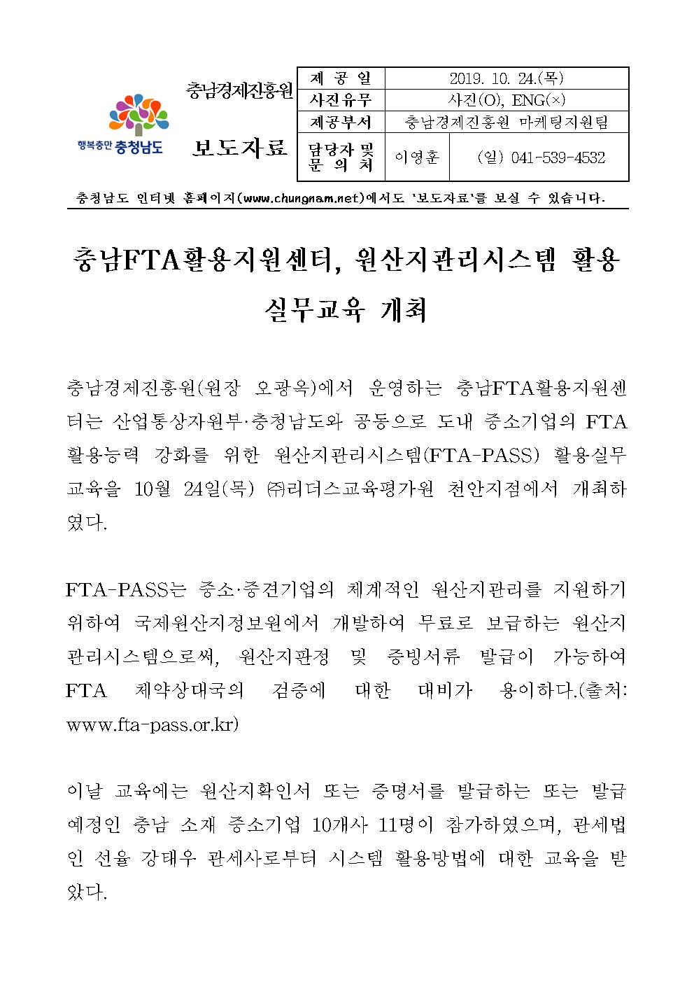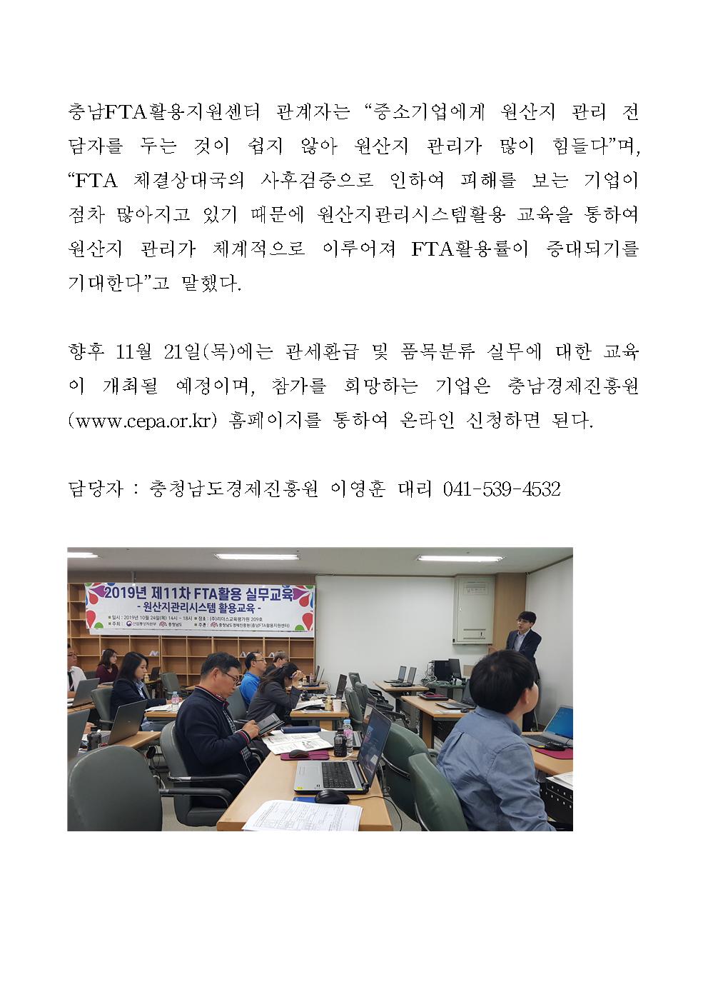 | 충남경제진흥원, 충남FTA황용지원센터 원산지관리시스템 활용 교육 실시 [2019.10.24] | |||