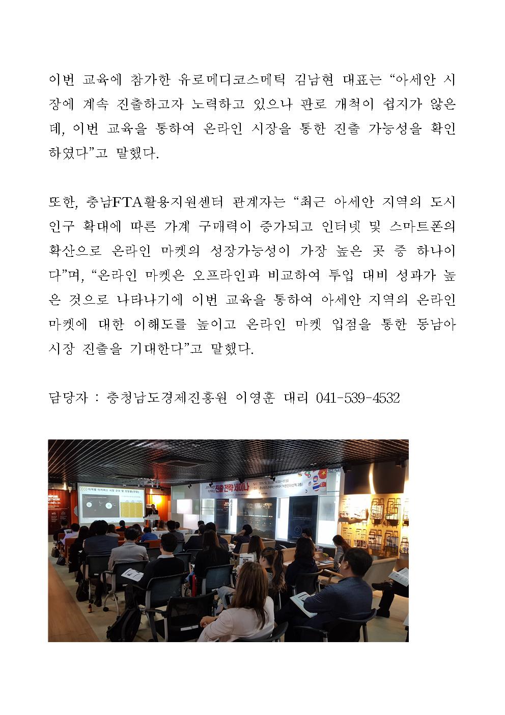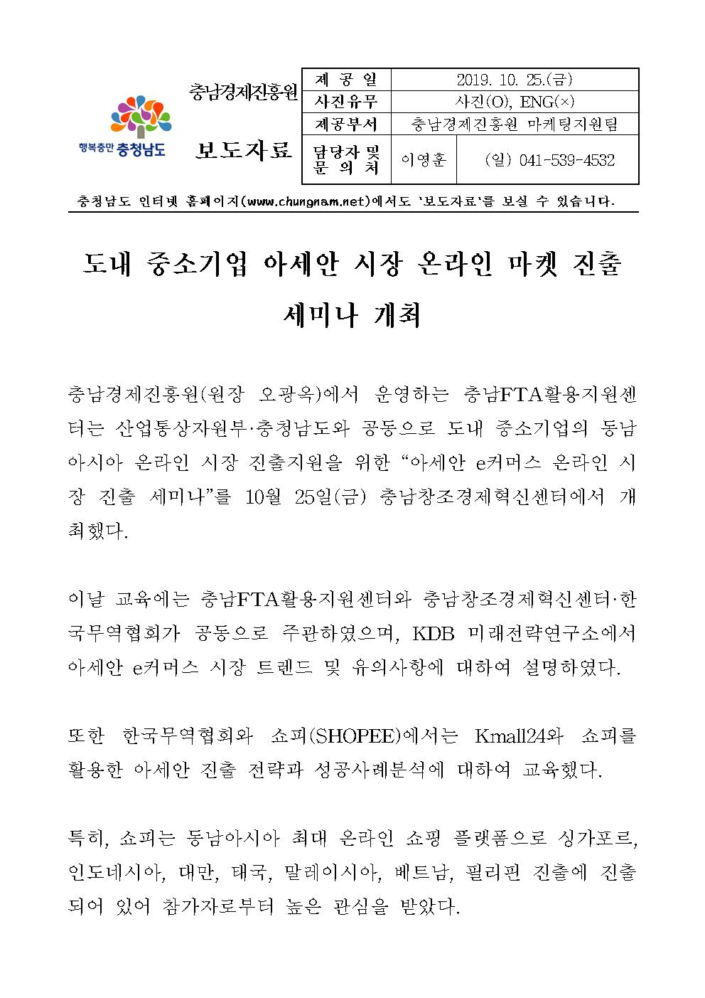 | 충남경제진흥원, 도내 중소기업 아세안 시장 온라인 마켓 진출 세미나 개최 [2019.10.25] | |||
